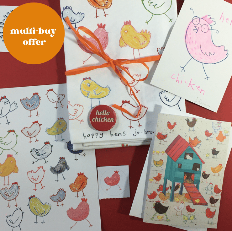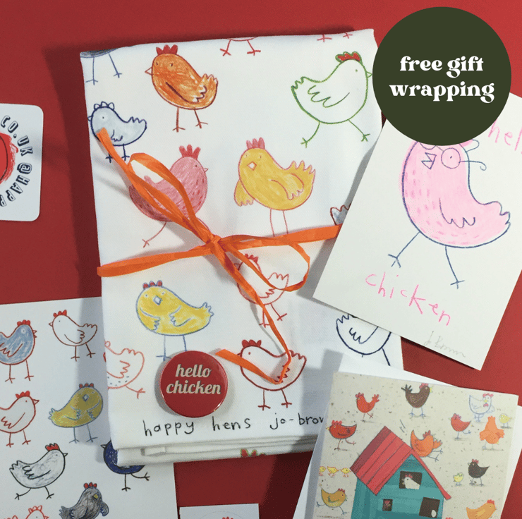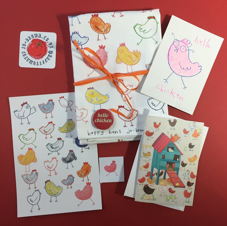 i love chickens super gift box, a box of illustrated goods featuring hens, a perfect gift for a chicken fan. All items designed by Jo Brown, illustrator and digitally printed in the UK. © Jo Brown.