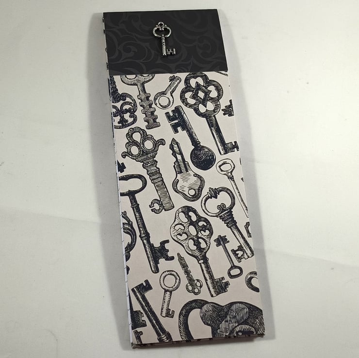 Slim, lined notepad covered in a vintage style, key themed card, together with a coordinating black patterned paper. The pad has approximately 30 sheets and has a hard board back. The pad has been embellished with a small metal key charm.