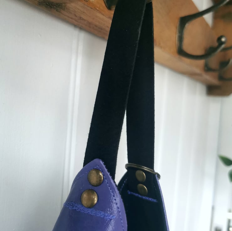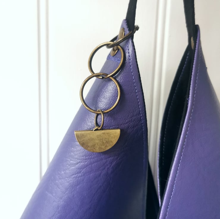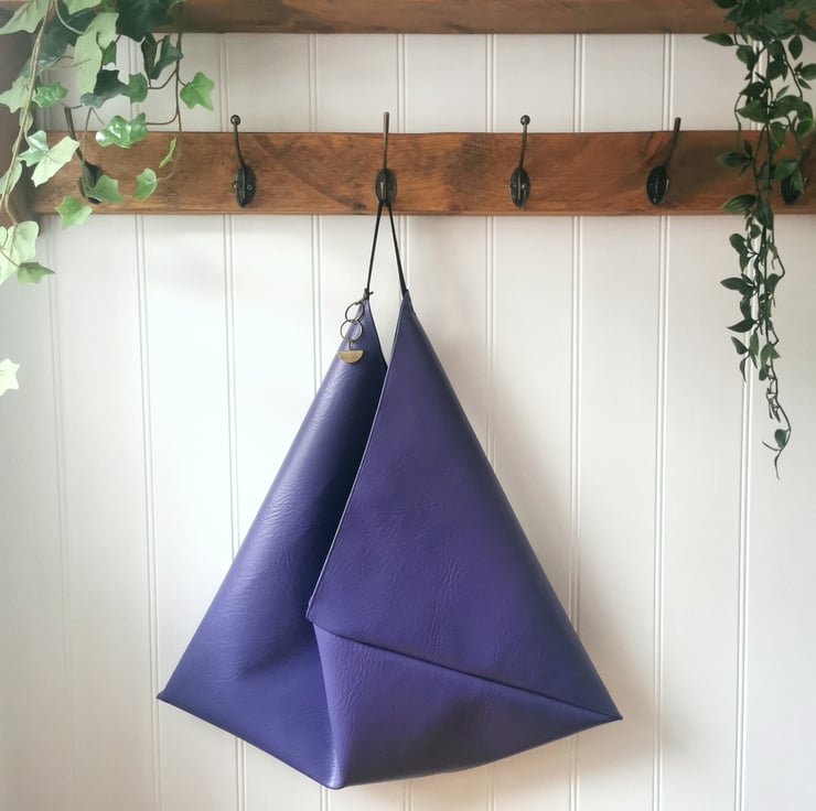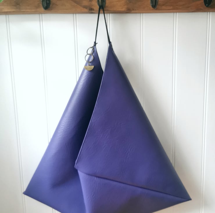 A purple vegan leather origami design shopper bag with a black soft faux suede strap, antique gold rivets and an antique gold half moon charm - lined in black cotton. The bag also features an internal zipped pocket - ideal for your mobile phone, keys and cards (see the last pic).