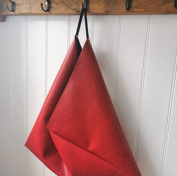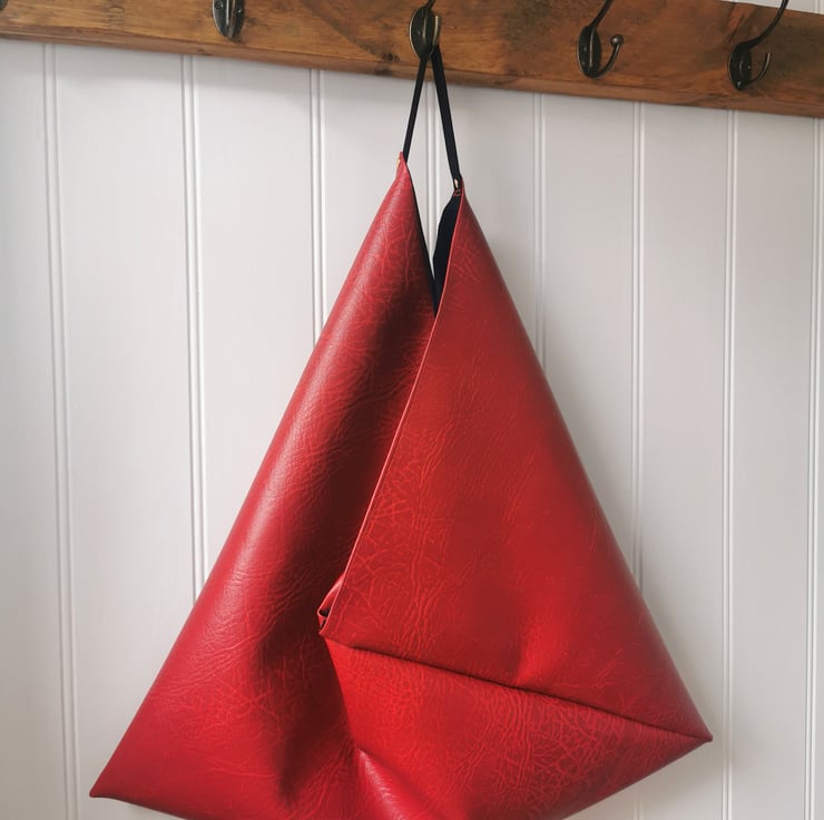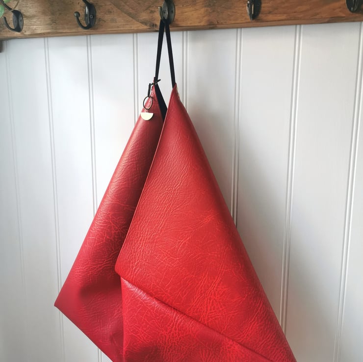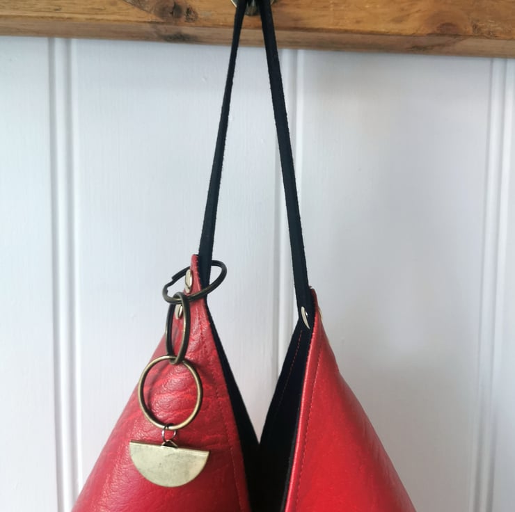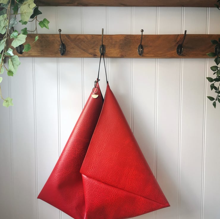 A bright red vegan leather origami design shopper bag with a black soft faux suede strap, antique gold rivets and an antique gold half moon charm - lined in black cotton. The bag also features an internal zipped pocket - ideal for your mobile phone, keys and cards (see the last pic).