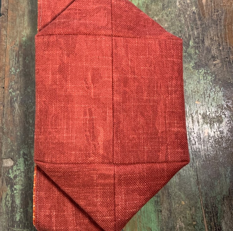 Reversible fabric storage basket made from reclaimed Andrew Martin curtain fabric and a designer roll end remnant in shades of orange and yellow with a raised texture. Can be used with a turn-down to make the most of the contrasting fabrics.