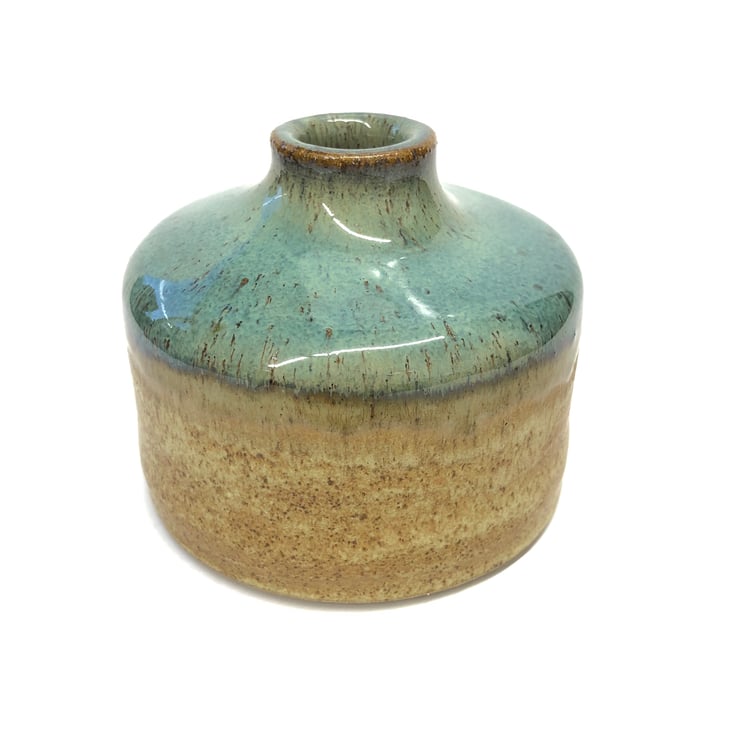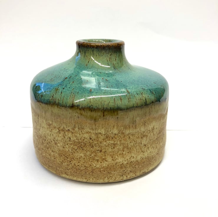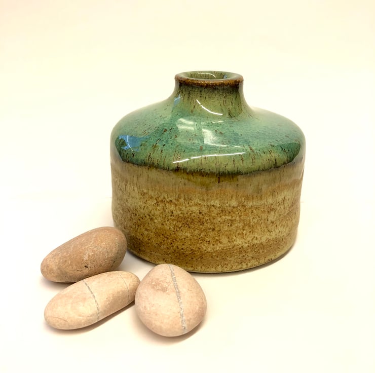 The glazes in this stoneware ceramic vase are full of interest. The shiny top is a greeny turquoise with brown speckles and the sides are glazed with a matt glaze called Milled Pepper which gives a warm oatmeal and brown effect. These beautiful earthy colours really set off the striking shape of this pot which looks great filled with seedheads or arranged with a couple of pebbles to set it off!