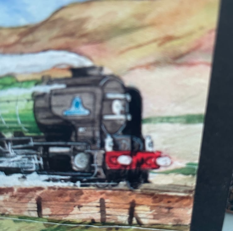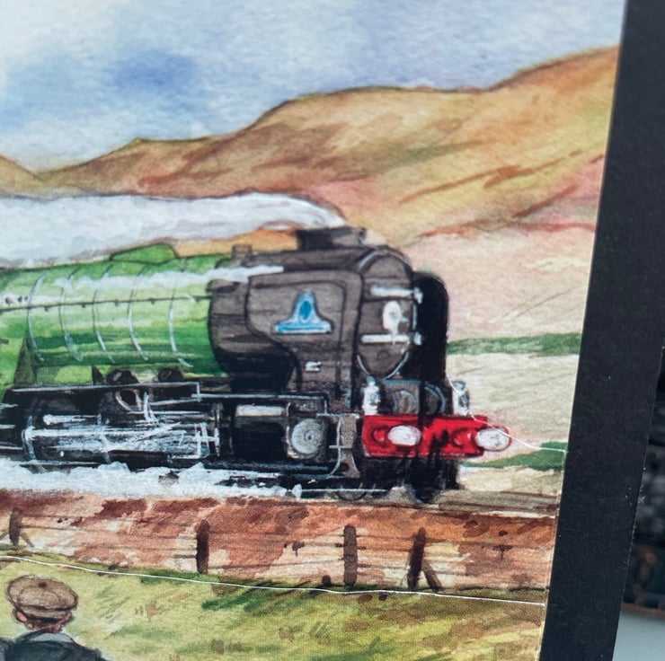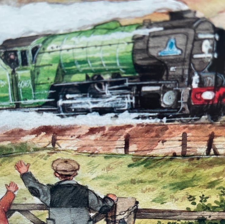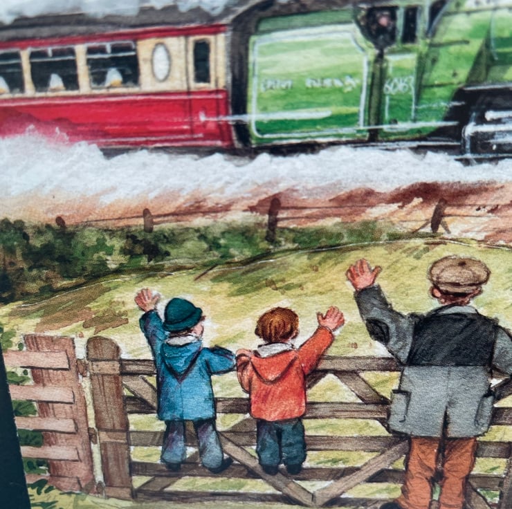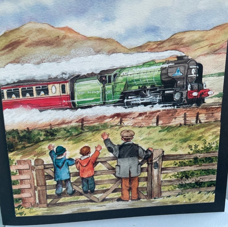 A lovely evokative scene for any train enthusiast. This 15x15cm card features a painted layered scene of a green steam engine racing past 2 children and an adult. They are waving to the passengers as they pass. A very nostalgic picture and a great card to send to a rail enthusiast. Inside the card has a miniature of the same scene and the greeting just for you.