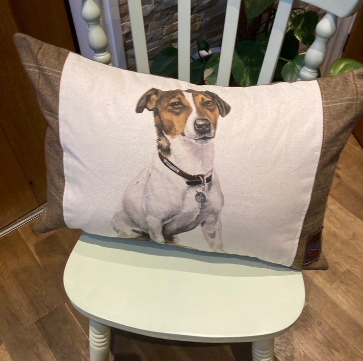 Lovat Tweed cushiion with a dog on the front. Comes with polyester inner.