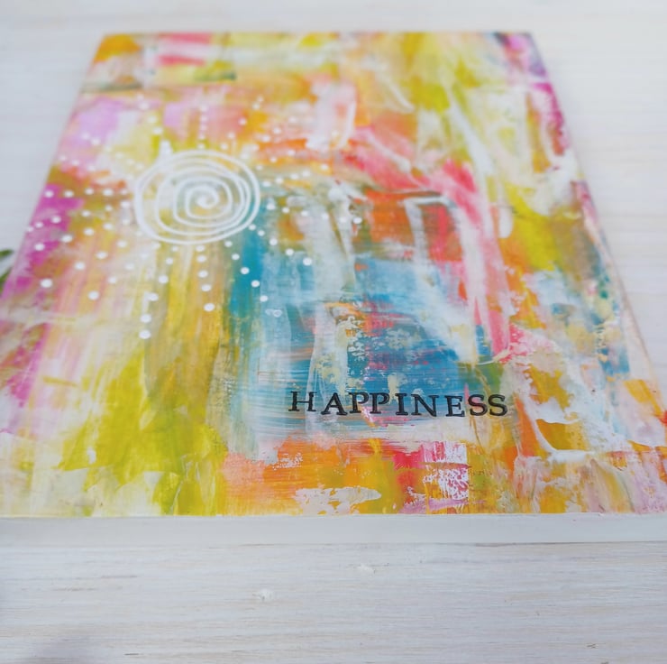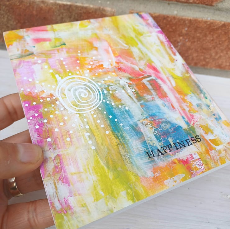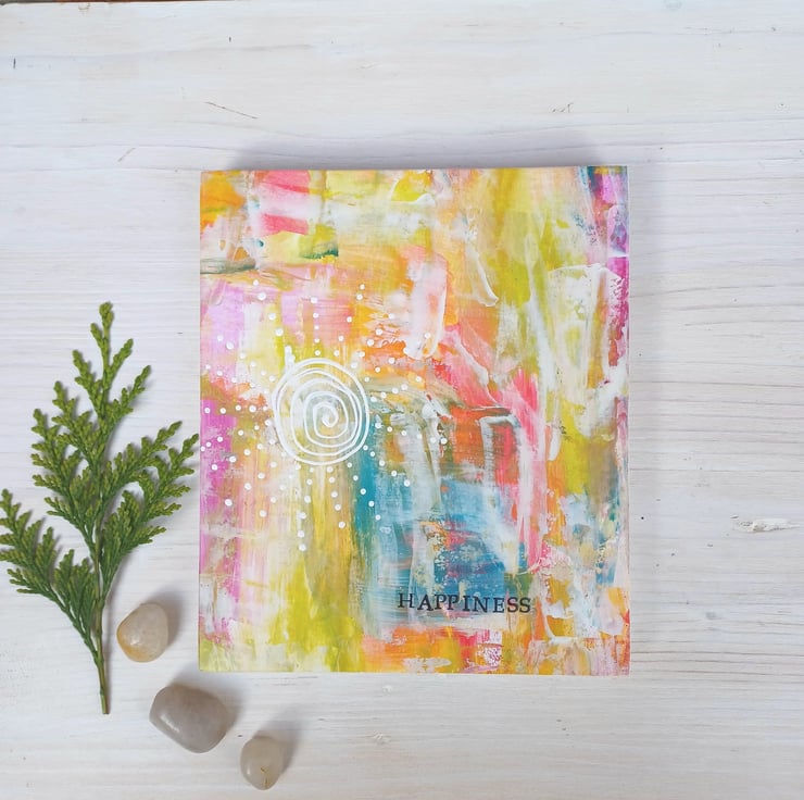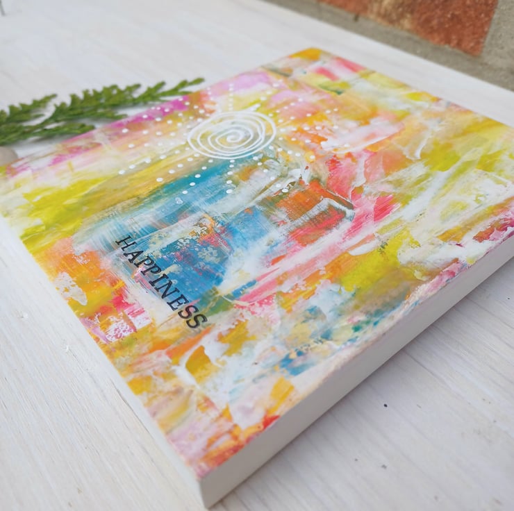 Happiness. A bright and colourful piece of original art bearing the word HAPPINESS. I have added a pretty little hand painted, decorative doodle design of the sun using white acrylic paint.
