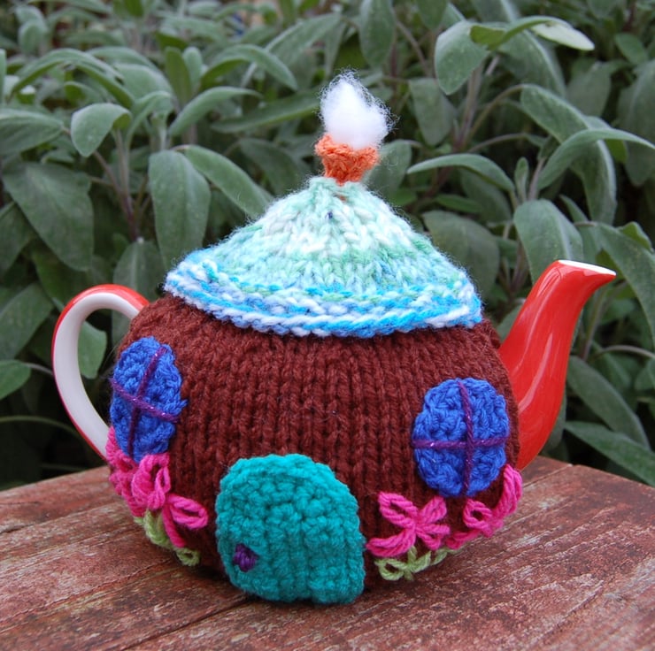 A quirky country cottage tea cosy for a tea for one or two teapot. Knitted using acrylic yarns.