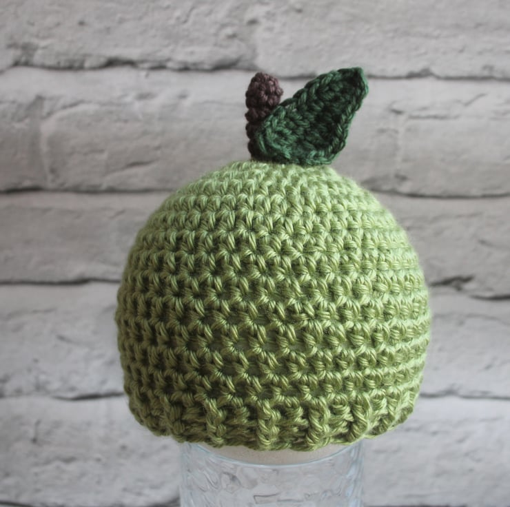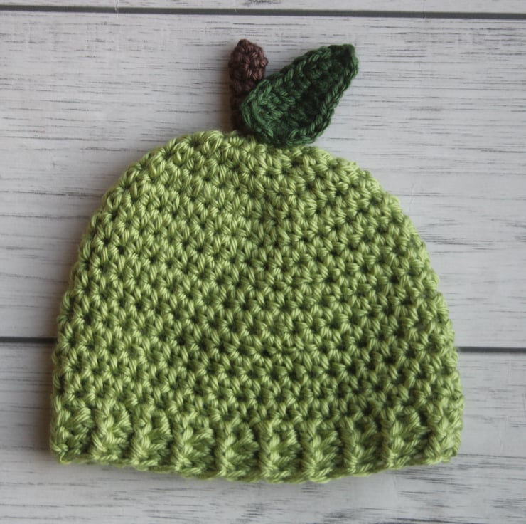 Features a stretchy brim on the bottom and a brown stalk and dark green leaf motif on the top.