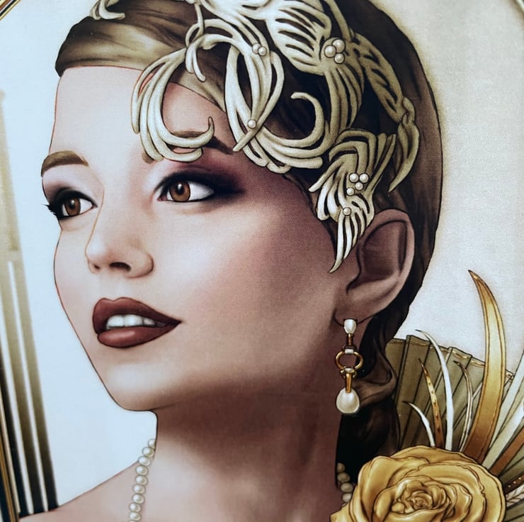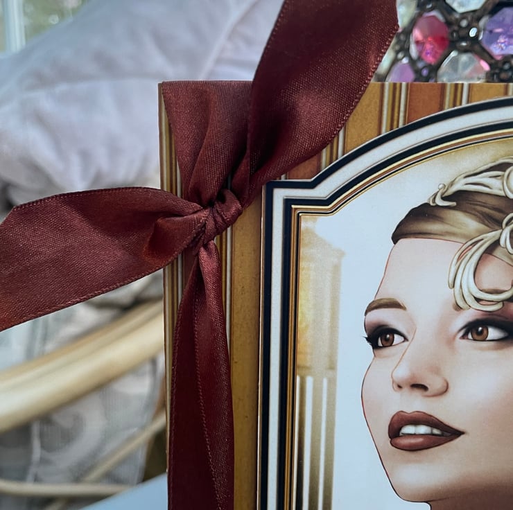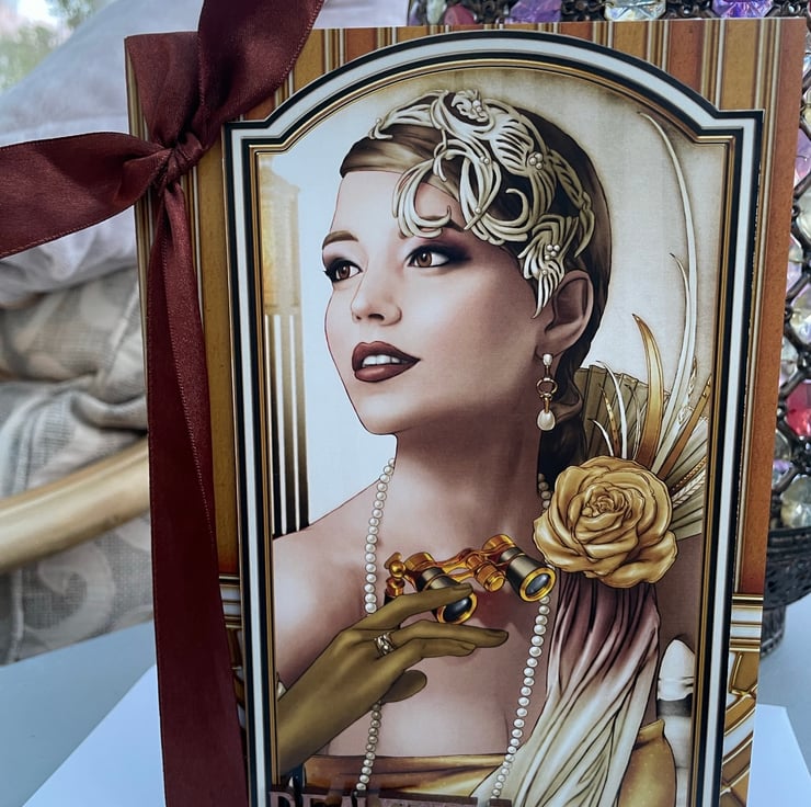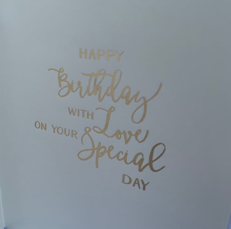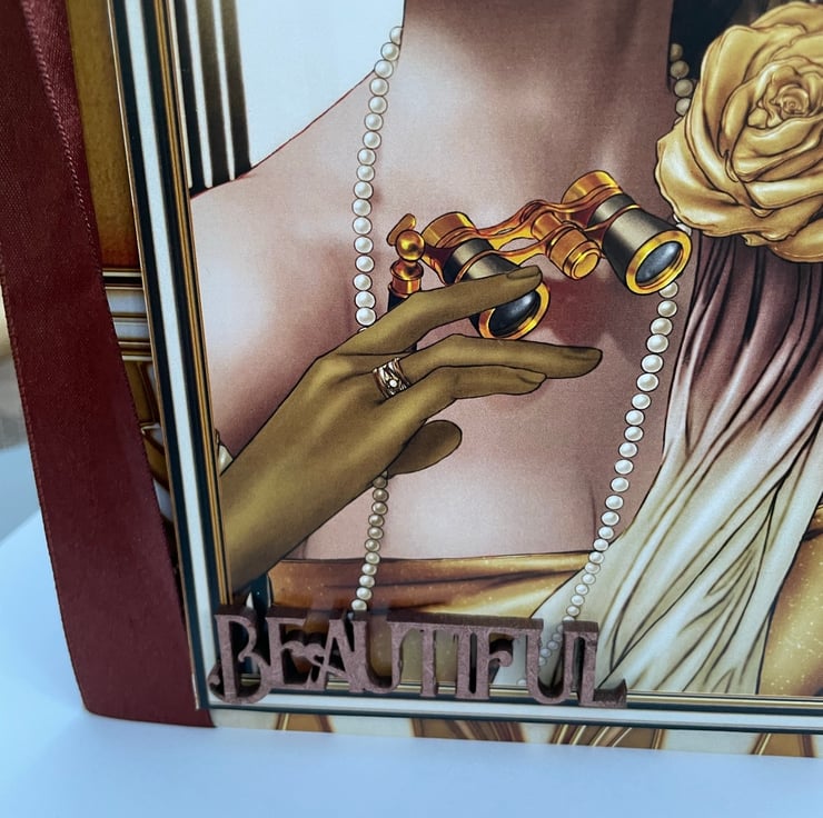 This card oozes glamour. This A5 sized card features a very glamorous lady. She is looking into the distance and is holding opera glasses. She is wearing a glamorous gold dress and a large rose embelishment. The design is complimented with a copper sprayed wooden embelishment that says Beautiful, a chocolate brown ribbon is tied to the spine. Inside the card has a cream insert with the verse Happy Birthday with love on your special day ingold foil. A truly gorgeous card to celebrate a birthday.
