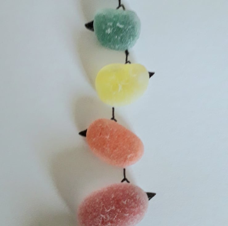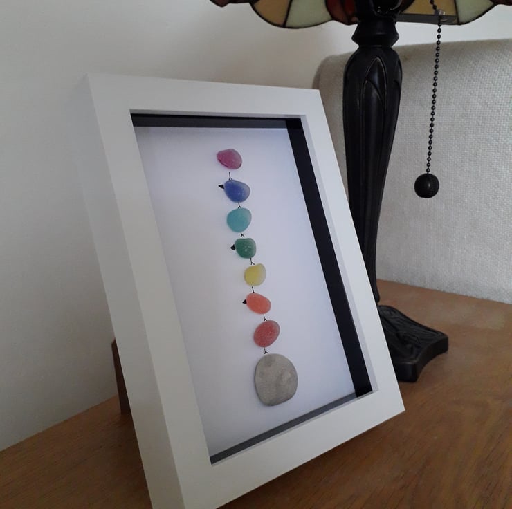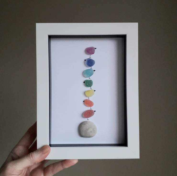 Unique picture of Sea Glass Balancing Rainbow Birds. The sea glass is hand coloured to match the colours of a rainbow. This made to order artwork is mounted on white card in a high quality white contemporary frame with a high shine to the glass (15 x 20 cm). It can have the hand written words 'stay balanced' added. Send me a message if you would like this written on the picture.