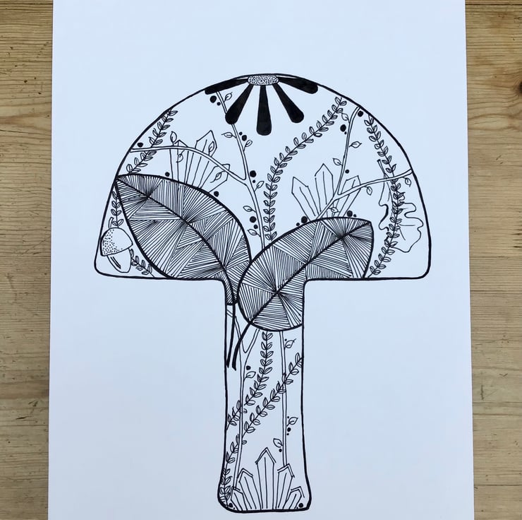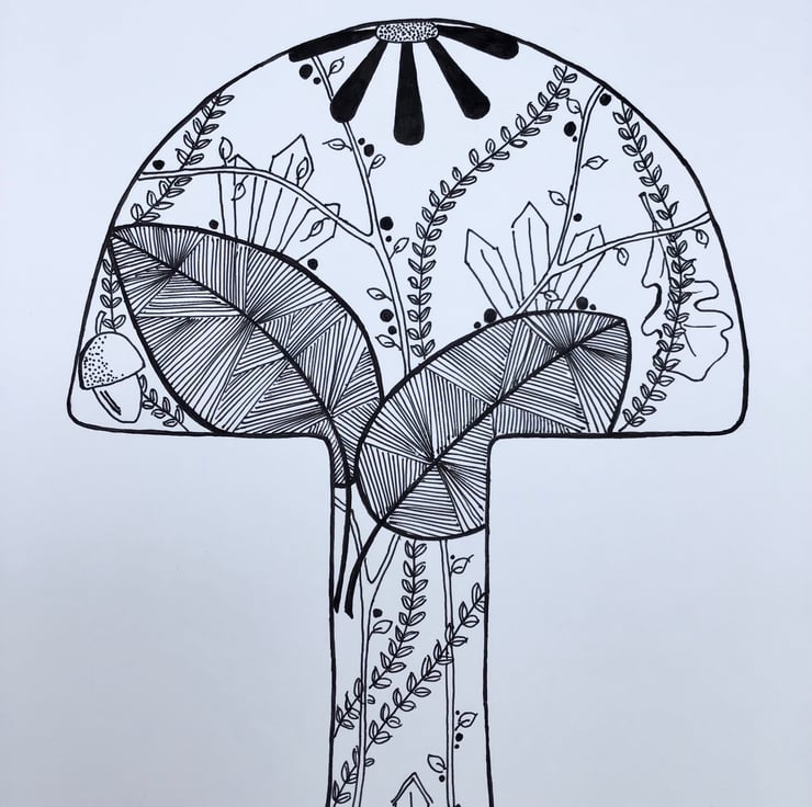 Hand drawn mushroom outline with leaves, twigs, acorn and crystals incorporated into the drawing.