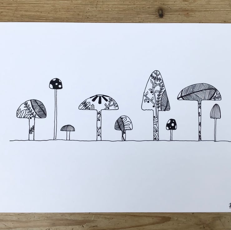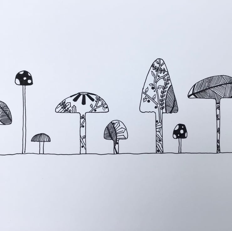 Hand drawn mushroom outlines with leaves, twigs and crystals incorporated into the drawing.
