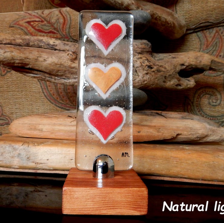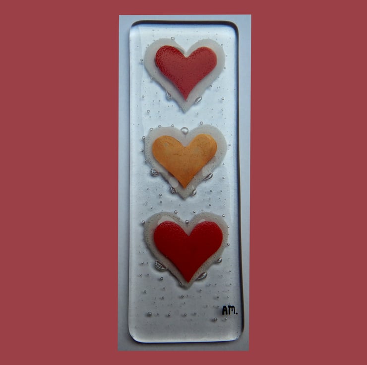 Handmade fused glass hearts has been made by combining a number of different techniques. The hearts are made from glassline powder which is then sandwiched between two layers of glass. The coloured glass hearts are fused onto the front of the layered glass. This gives a slight feeling of three-dimension.