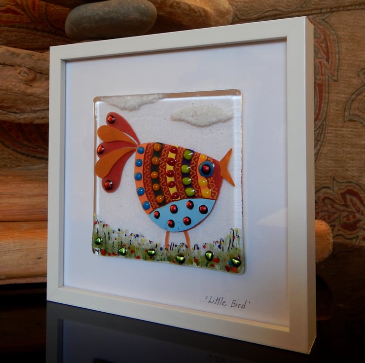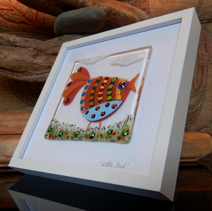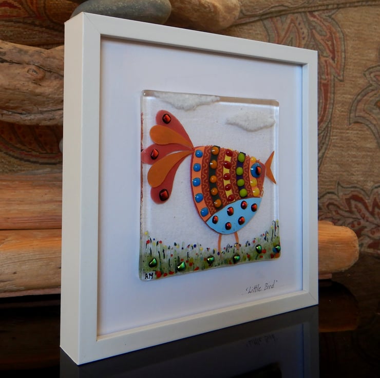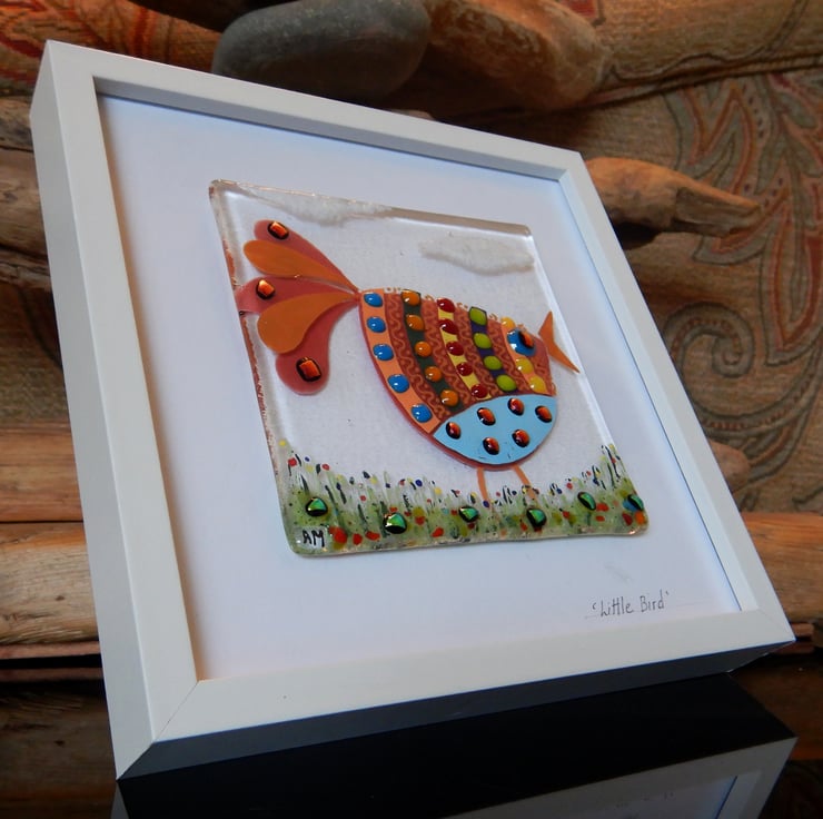 'Bird' is made completely from glass which has been fused in my kiln. There is no enamel, glass paint or any other materials used, this picture is 100% pure bullseye fusing glass!