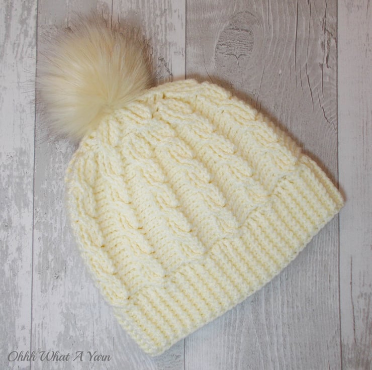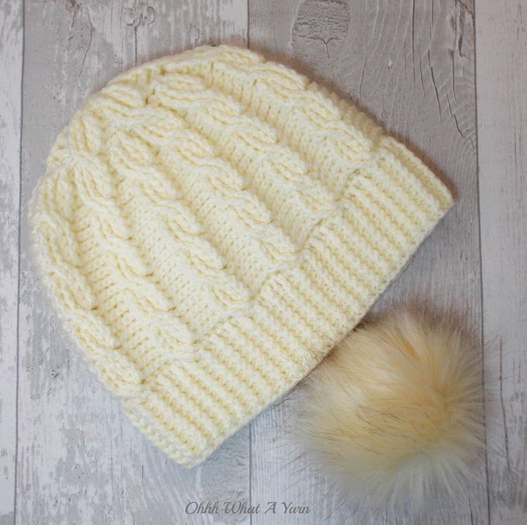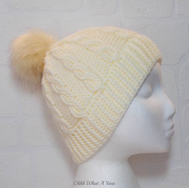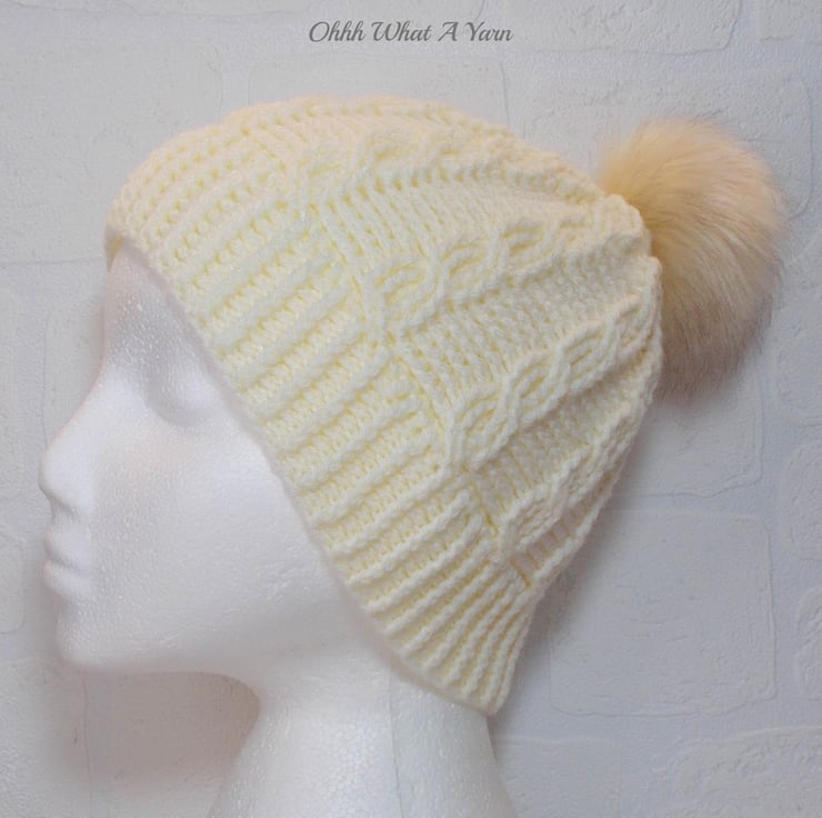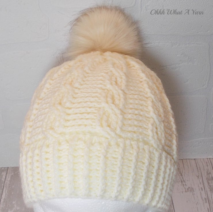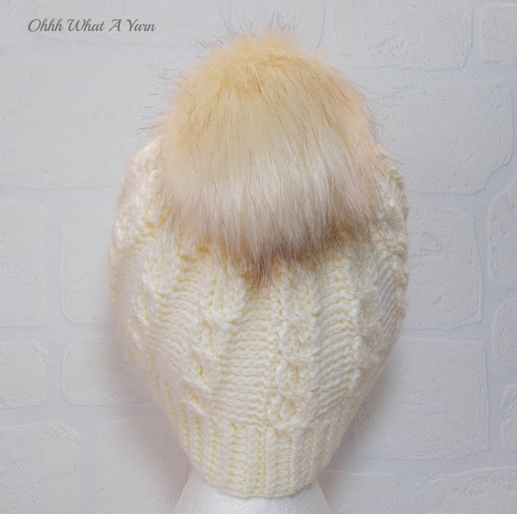 It has a gorgeous cable and bobble pattern and a ribbed edging, and I have added a faux fur pom pom. There is a button on the inside of the hat so you can easily remove the pom pom by unhooking the loop around the button if you prefer your hat fluffless and for washing purposes.