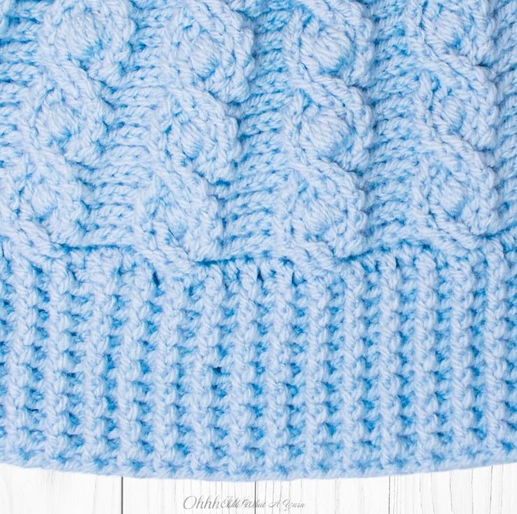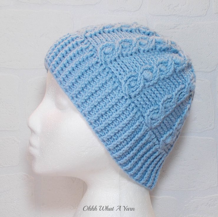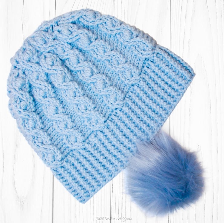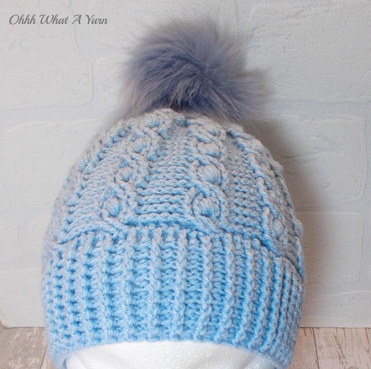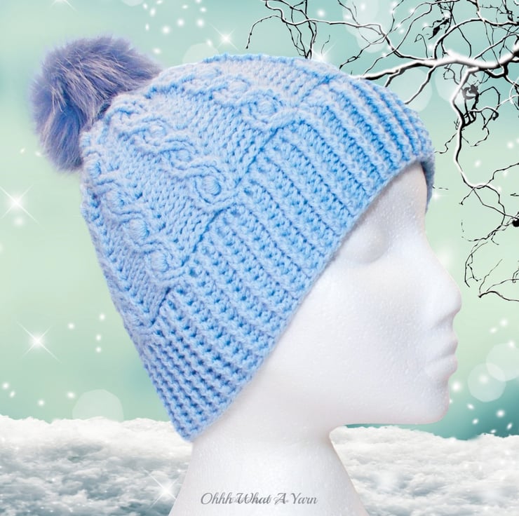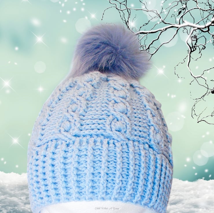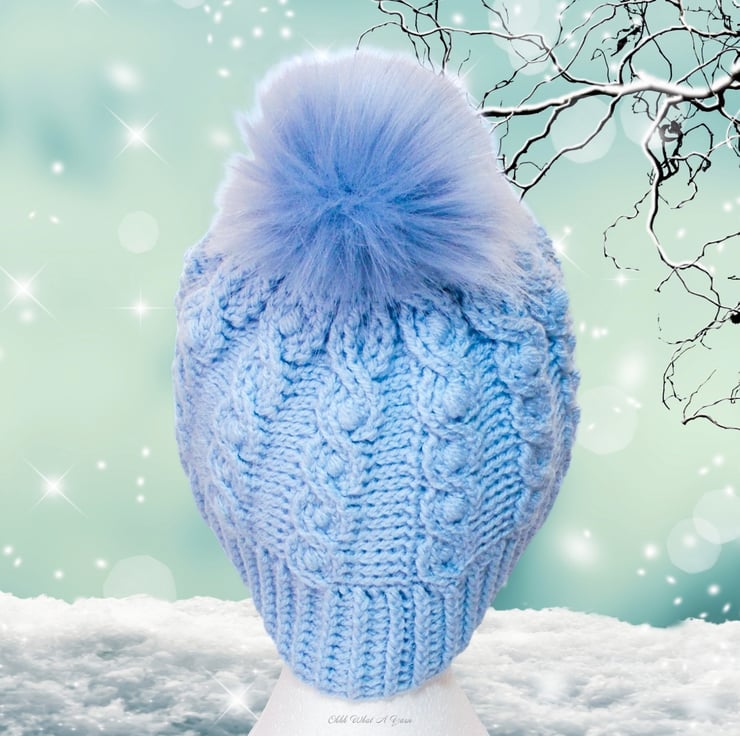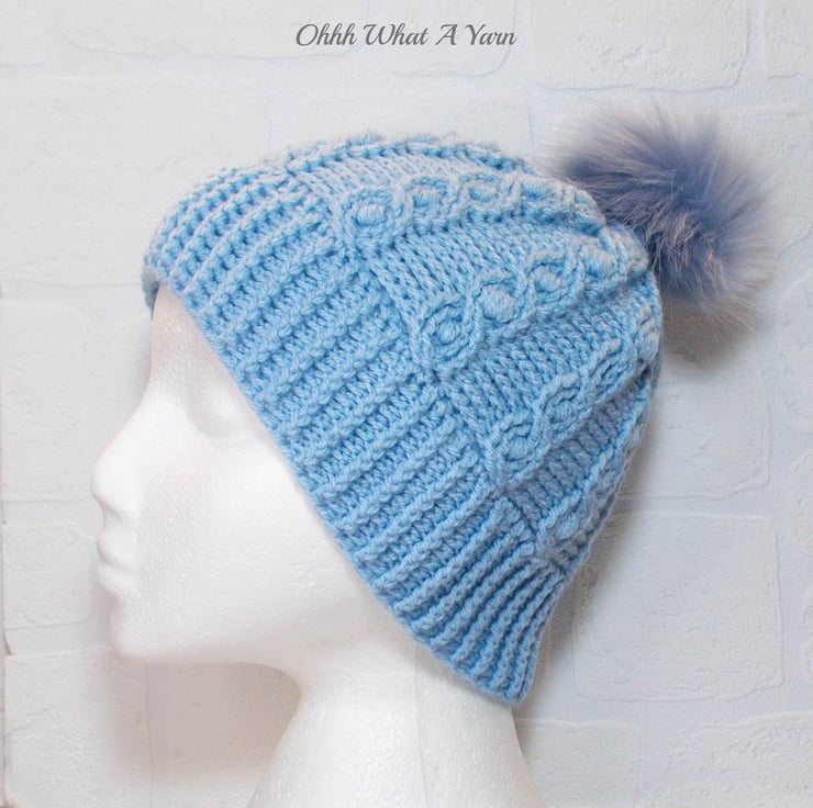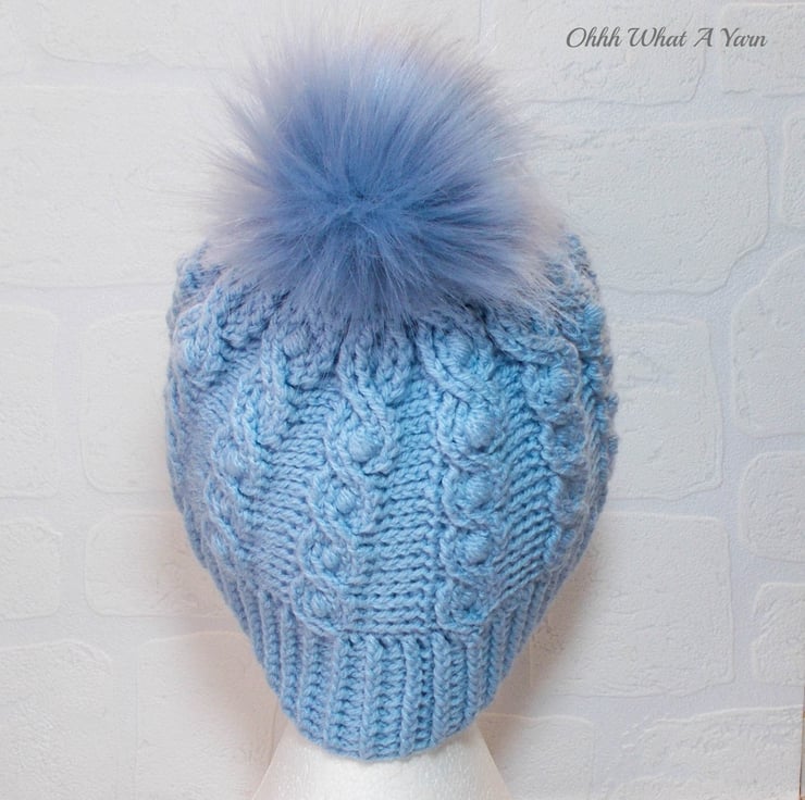 It has a gorgeous cable and bobble pattern and a ribbed edging, and I have added a faux fur pom pom. There is a button on the inside of the hat so you can easily remove the pom pom by unhooking the loop around the button if you prefer your hat fluffless and for washing purposes.