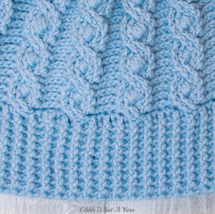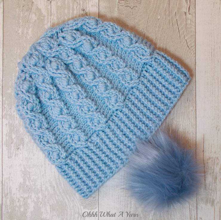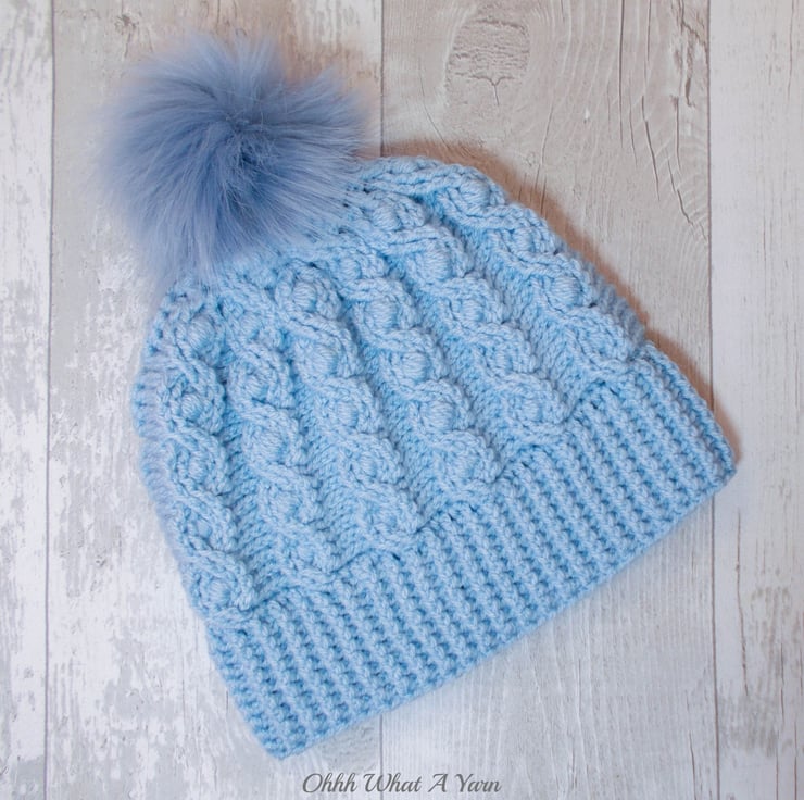 Crochet hat, beanie. Light blue ladies cable pom pom hat. Ladies hat.