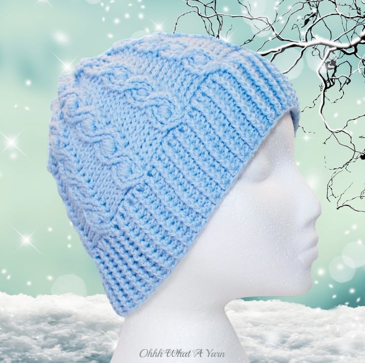 This cosy hat is crocheted using gorgeous premium 100% acrylic yarn in a gorgeous light/baby blue colour.