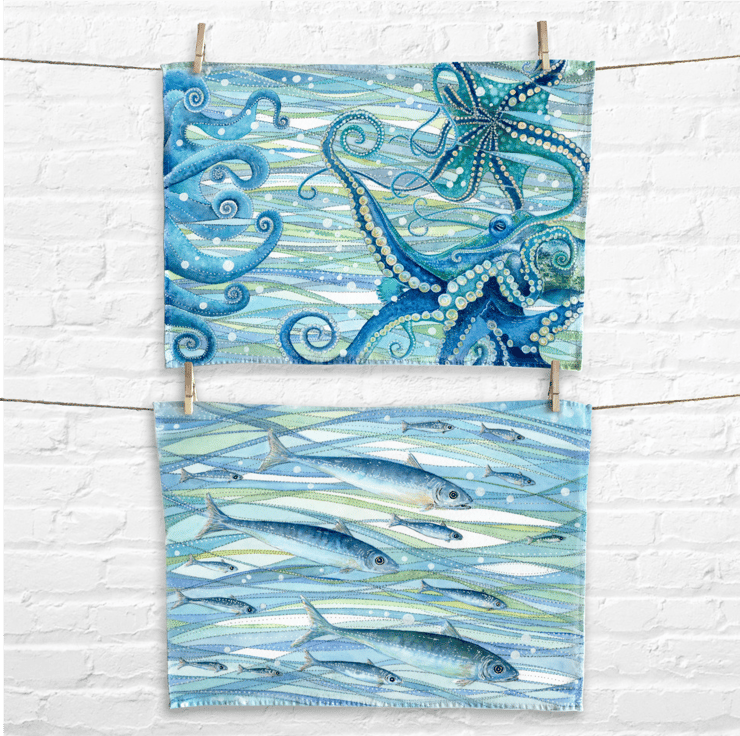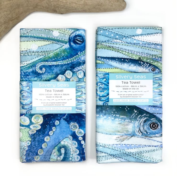 Two beautiful tea towels featuring fish & octopus to add a lovely coastal touch to your kitchen. These tea towels are taken from original watercolour paintings by Elizabeth Stocker (my very talented sister!) and features a gorgeous shoal of fish and swirly octopus in a silvery, wavy sea of lovely green and blue hues. The tea towels are 100% cotton, measure 66cm x 50cm and are manufactured in the UK. They come with a hanging loop to keep your kitchen looking tidy and are neatly folded into a lovely bellyband so would make a perfect gift for lovers of nautical and seaside decor.