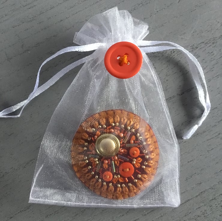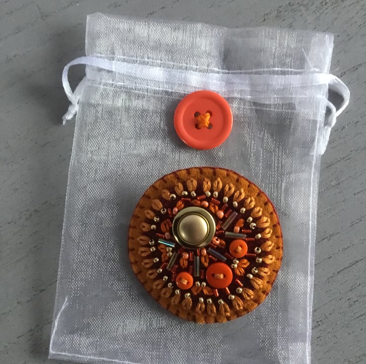 This hand embroidered brooch is gift wrapped in an organza bag, decorated with an orange button. Also a useful protective bag to keep the brooch in when not worn.