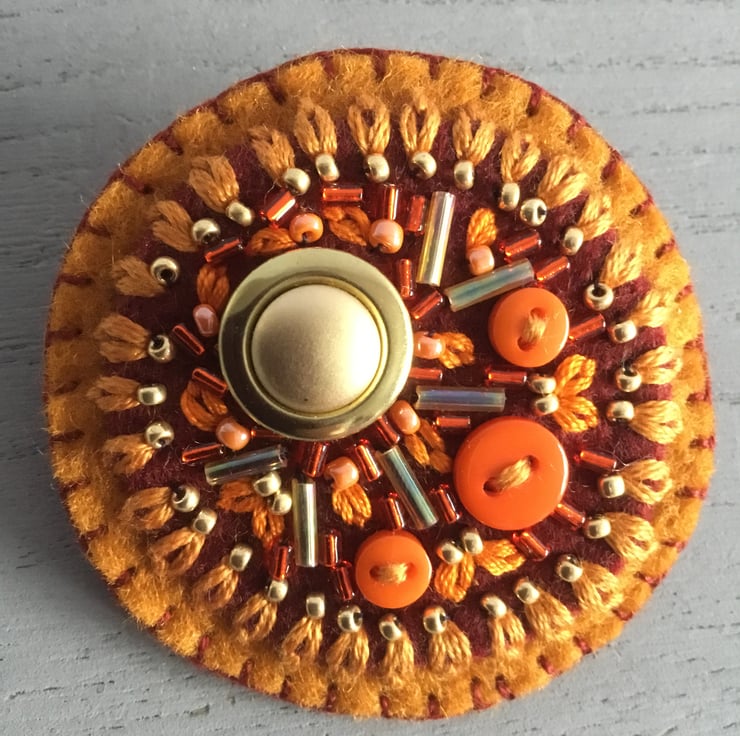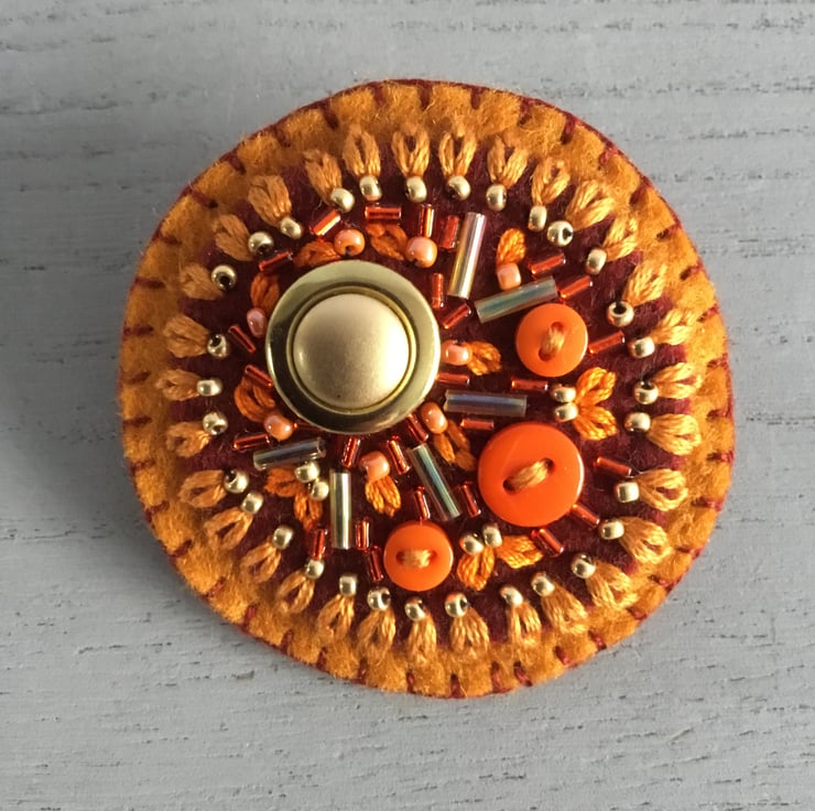 This Hand Embroidered Sun Ray Brooch has a golden vintage button stitched onto circles of umber and burnt orange felt. Glass bugle beads radiate from this button....like the rays of the sun and surrounded by hand embroidered Lazy Daisy Stitches with gold and orange seed beads and mini buttons in shades of orange colours.