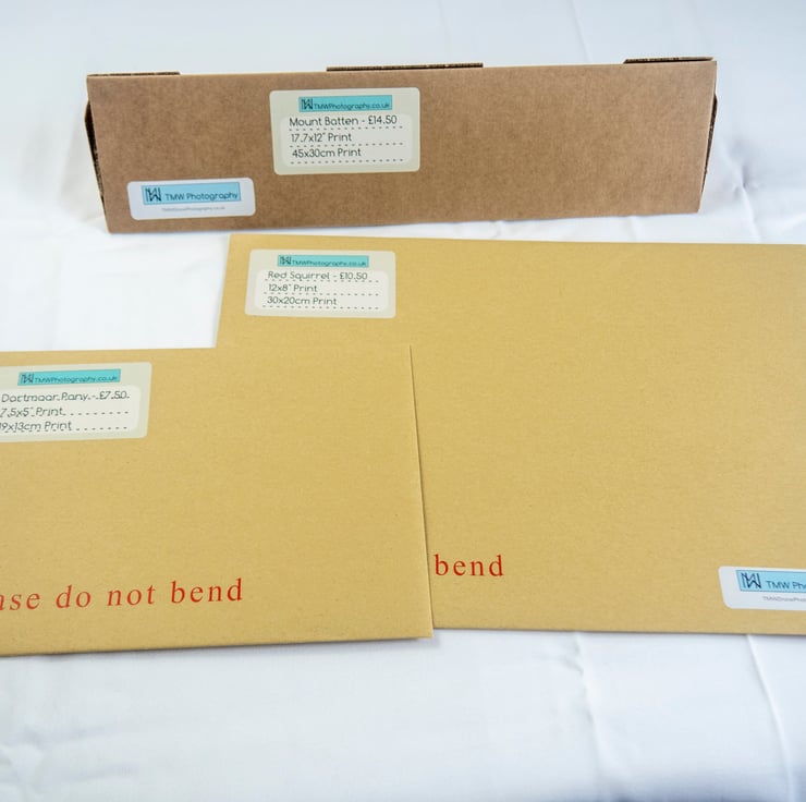 Larger prints are packaged in triangular poster tubes, and smaller prints in card backed envelopes, allowing for safe and secure postage without any plastic packaging. Mounted and framed prints are sent in compostable clear wrap, with plastic free outer packaging.