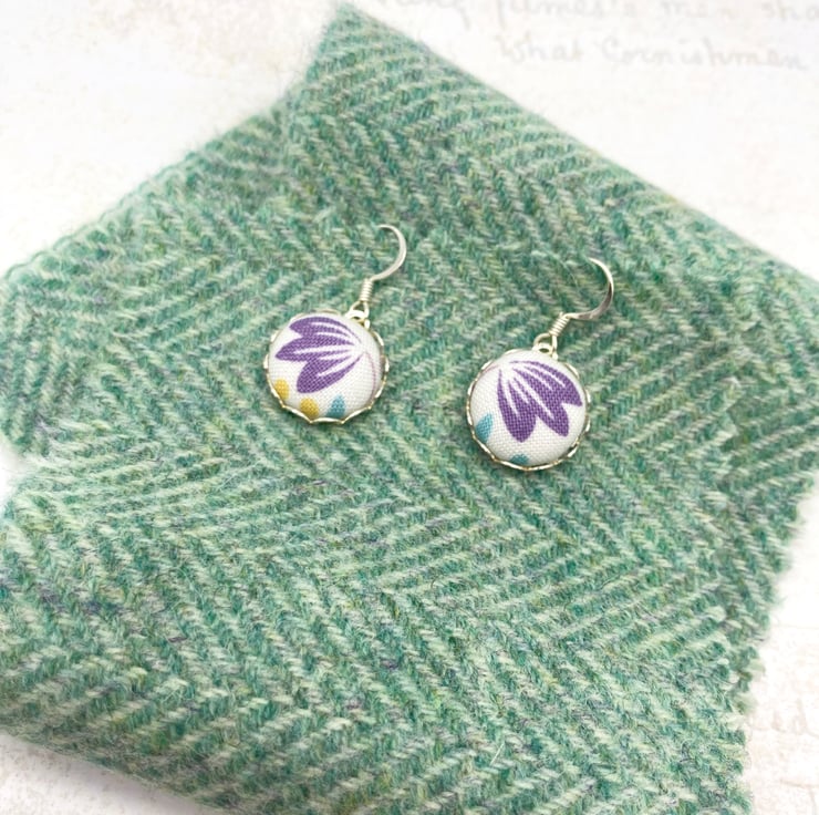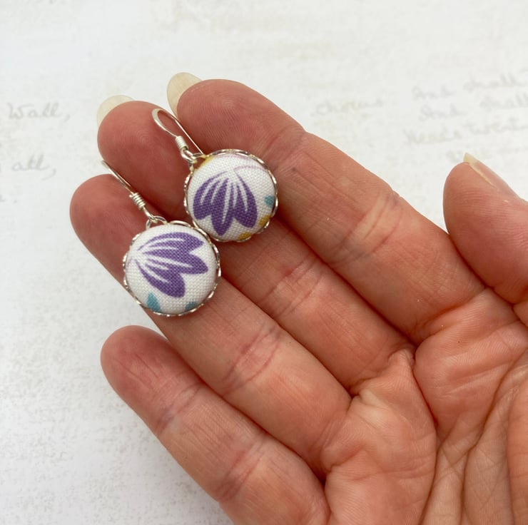 These lilac or lavender coloured tulip like flowers are nodding in the breeze on a plain soft white background. Created from 100% cotton quilters quality fabric, I’ve used these flowers and made matching mirrored 15mm flat back buttons. I’ve added a little toy filling to create a nice dome and secured them into silver plated (high quality brass base) scallop edged round settings.