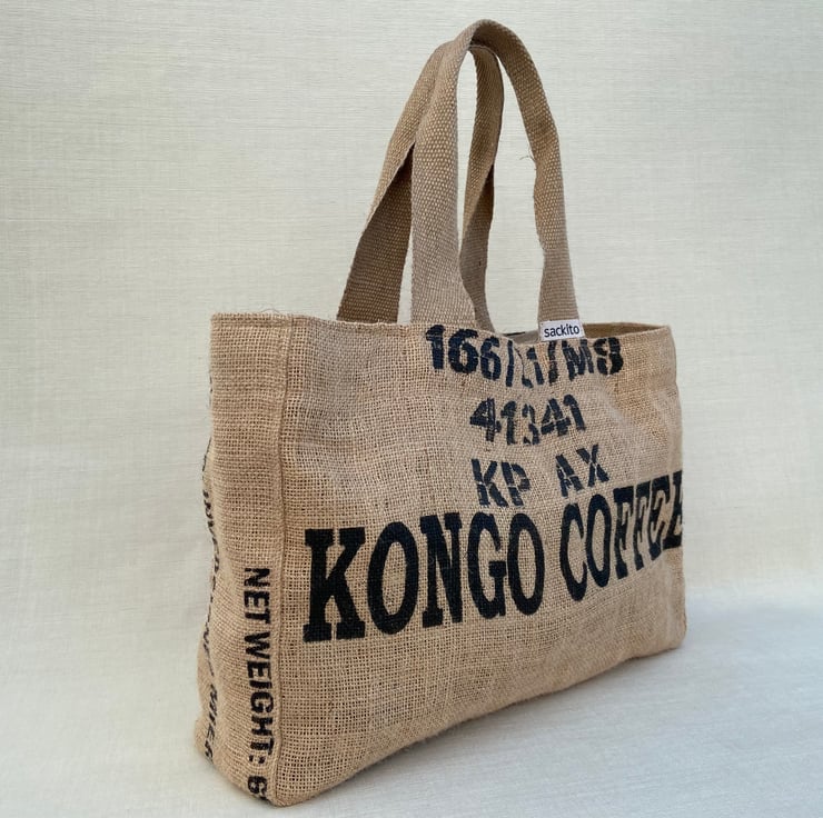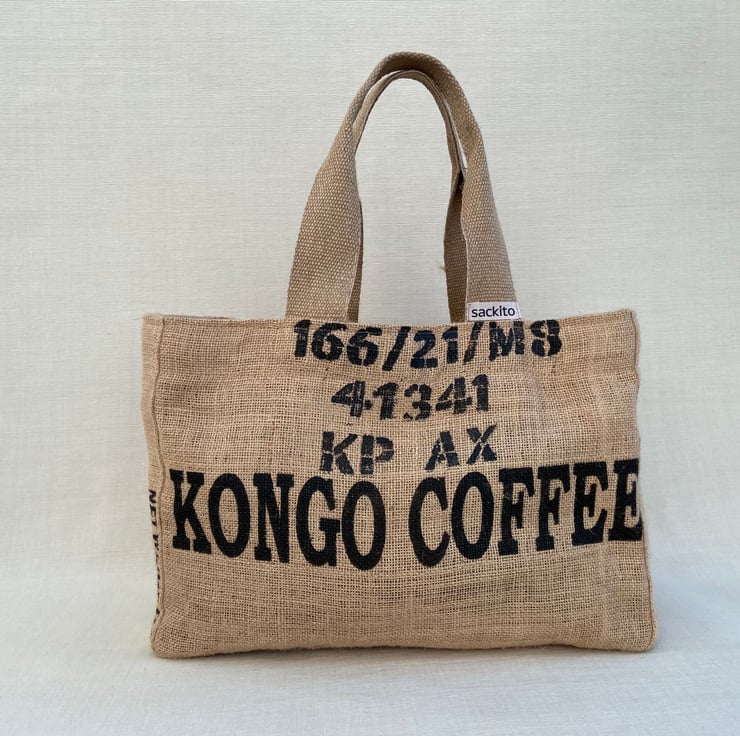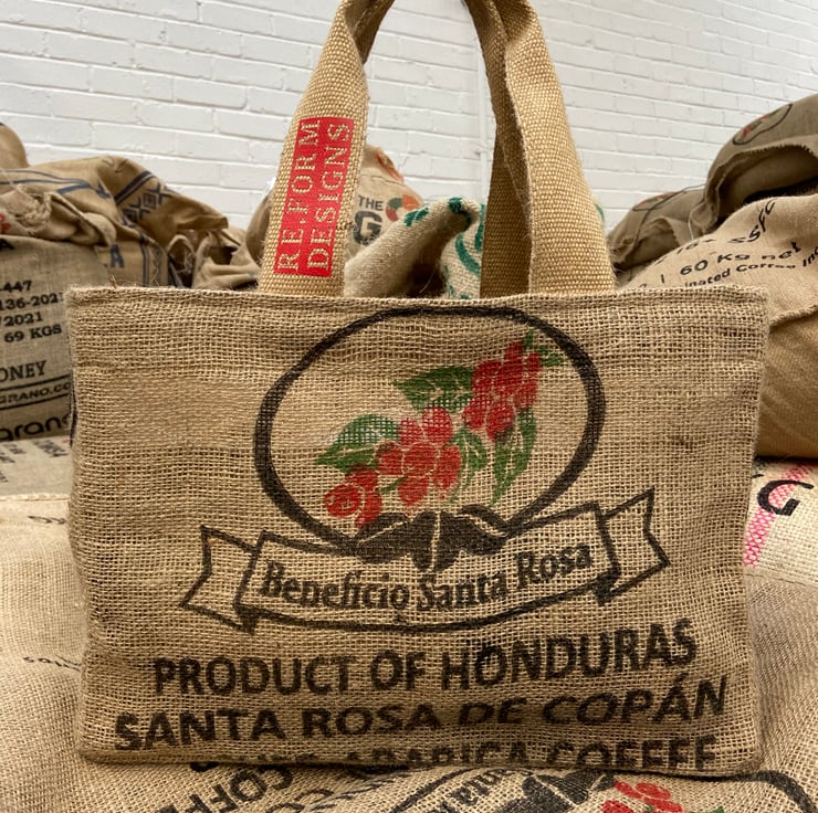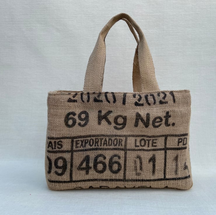 A great alternative to plastic bags handmade from reclaimed coffee sacks. Each bag comes with an unique coffee farm design print. Sturdy and durable jute material.
