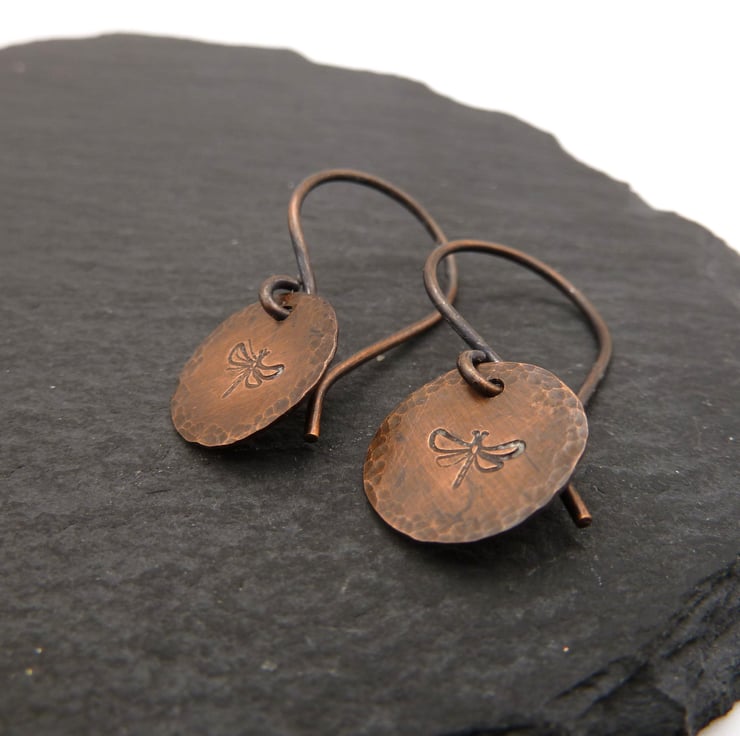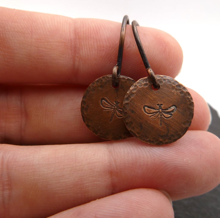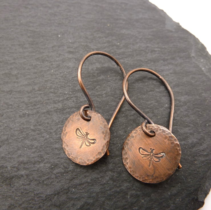 A pair of earrings made with handmade copper ear wires and handmade copper disc charms which have been stamped with a dragonfly.