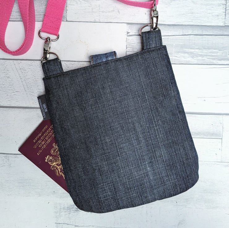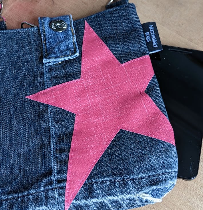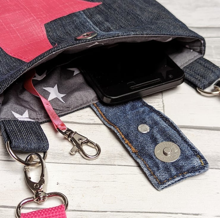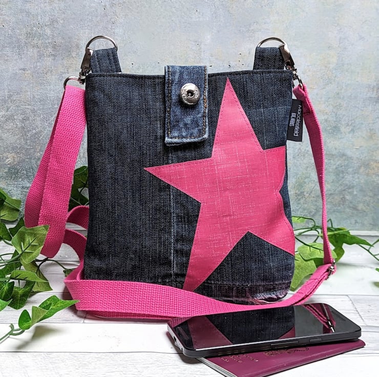 Preloved and grungy denim jeans have been used to make this upcycled mini cross body bag. With a PVC coated cotton pink star motif and strap, it's perfect for everyday use - throw in your phone, purse and a few essentials, this little bag has been designed to be light, casual and convenient with a vibrant pop of colour.