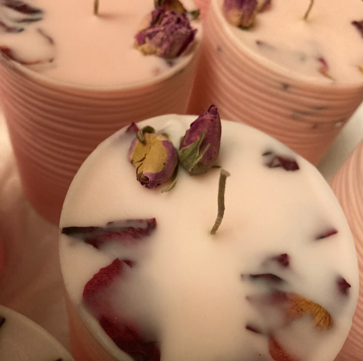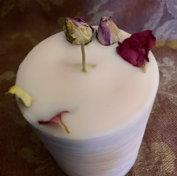 Please note that the dried rose buds sunk into the top of the candle are decorative. You may wish to remove them before use so you can enjoy them long term in your home, and avoid risk of scorching.