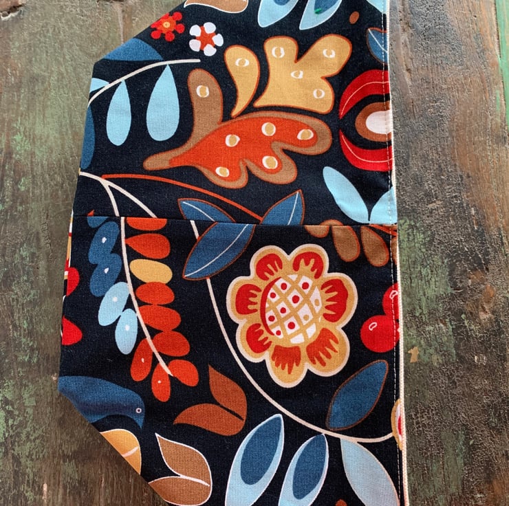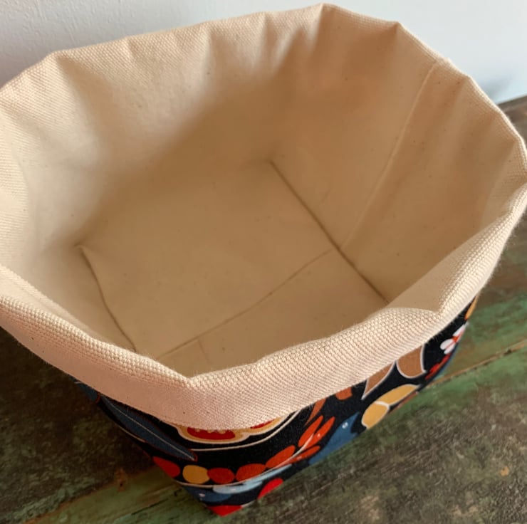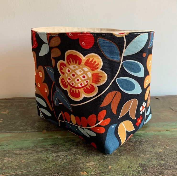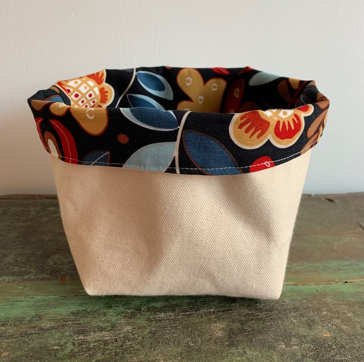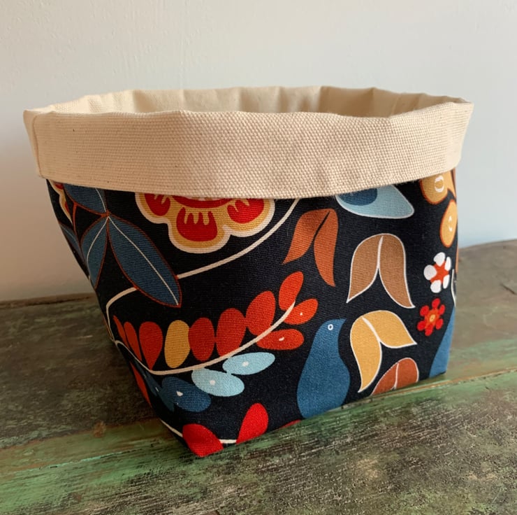 Reversible fabric storage basket made from a discontinued IKEA Scandi print cotton and cream cotton canvas. Can be used with a turn-down to make the most of the contrasting fabrics.