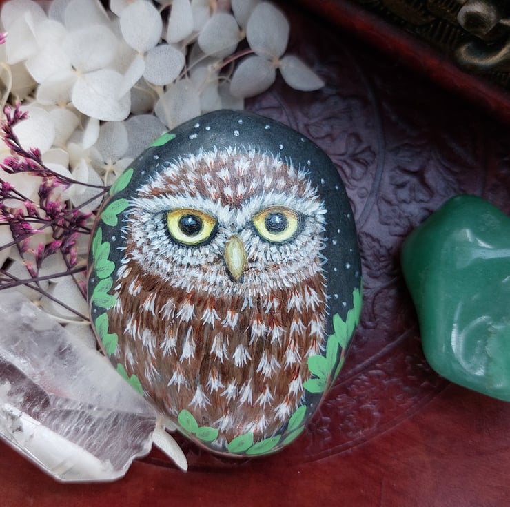 This little owl is painted in artist acrylics on a smooth river pebble. I have a little owl living in my garden and always enjoy briefly glimpsing it. Each of these pieces are unique, painted directly onto the stone, which dictates what it wants to become.