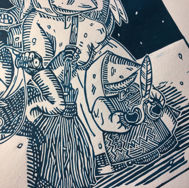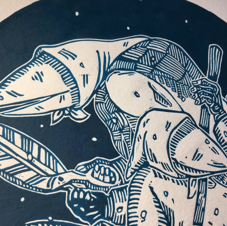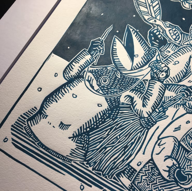 Water-based teal, matte ink print on white 220 gsm paper, hand-hand pressed with a spoon and touched up by hand also to give it a consistent tone all over.