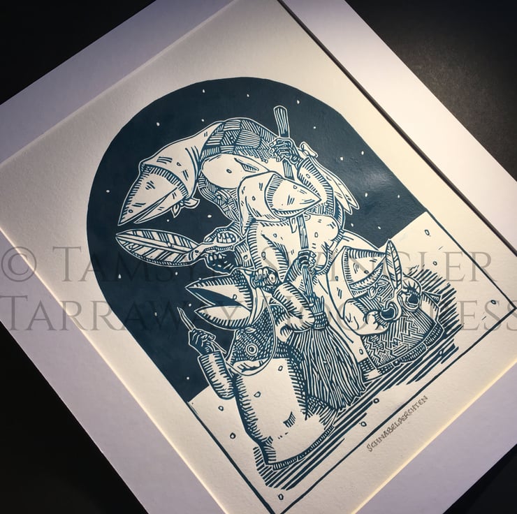 Limited edition of 12 prints of each colour in this design, soon to be pressed in black ink . Delivered mounted and wrapped in cellophane.