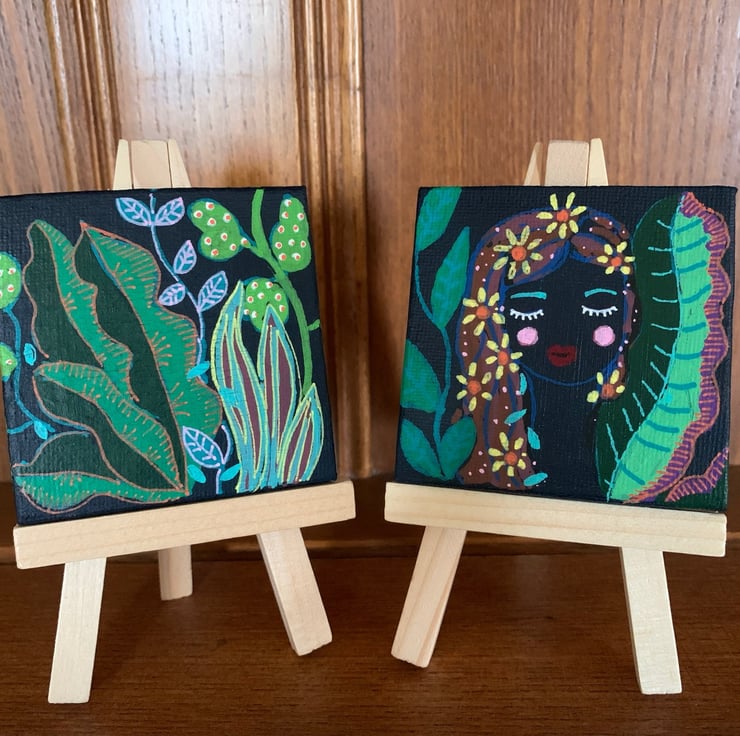 2 little Paintings with their own little easel each measuring 6.6 x 6.6 x 0.9cm