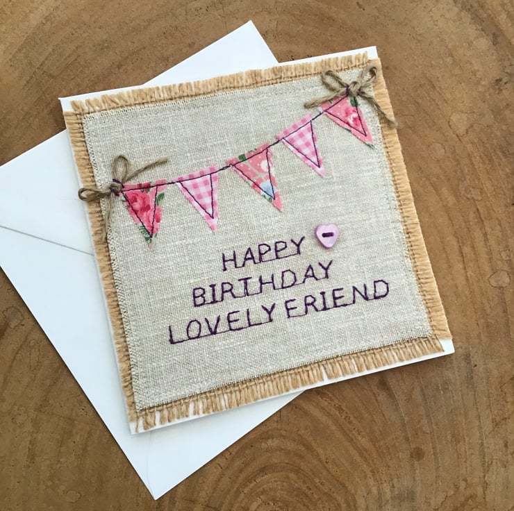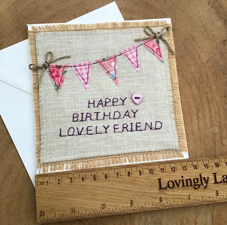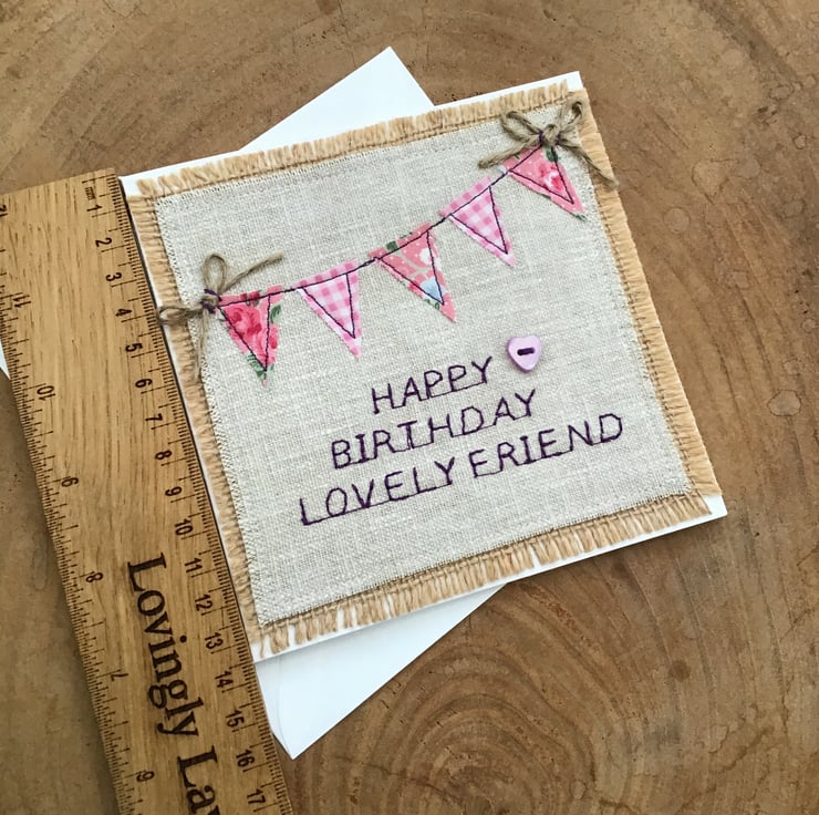 Handmade using a Laura Ashley linen and hessian background to free motion stitch and appliqué this pretty pink fabric bunting with twine bows and below embroidered Happy Birthday Lovely Friend with a little lilac heart button stitched to the side,