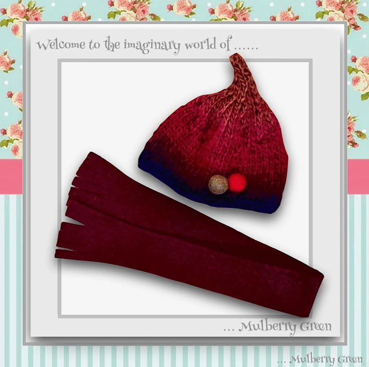 A lovely soft shaded red hat, decorated with little felt balls, to fit the Mulberry Green characters. The hat comes with a matching felt scarf..