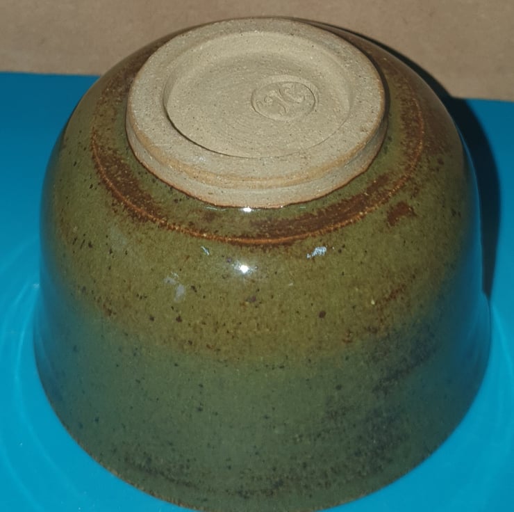 This is a little olive /oil bowl in an olive speckle glaze! It has a foot at the base ( see photos) which elevates it from the surface it sits on.