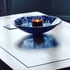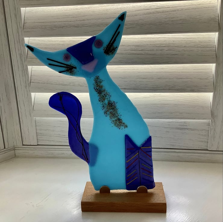 I’ve just finished creating this blue cat which has been made in my garden studio. I made this by fusing Glass on a tack fuse originally, followed by a second firing in the kiln to add all of the detail and decoration. It is really different and would please any animal lover, not forgetting cat lovers, this would make a truly lovely gift as all my pieces are one offs. Cat comes complete with a hardwood stand with specialised glass fittings. To ensure the cat is safe in the stand all that is required is for you to tighten the screws at the back of the fittings and “voila” it’s ready to be shown off in all its glory. The Glass used in this is a mix of bull’s-eye Opal blue glass with iridescent blue glass legs and tail which are decorated with stringers. The front of the cat has different coloured glass frit which was also used on the cheeks. Slices of Cane glass was used for the eyes.