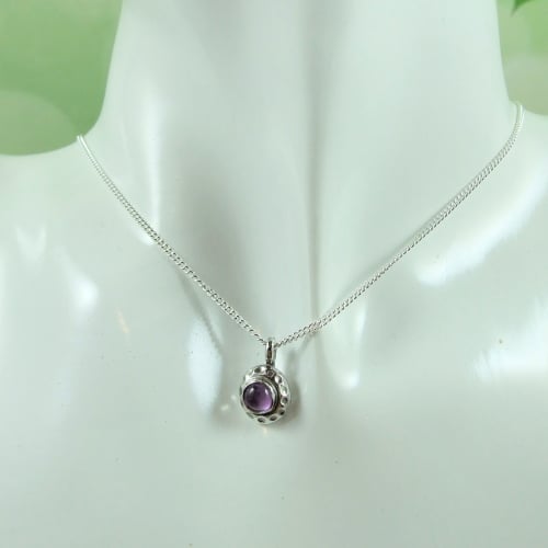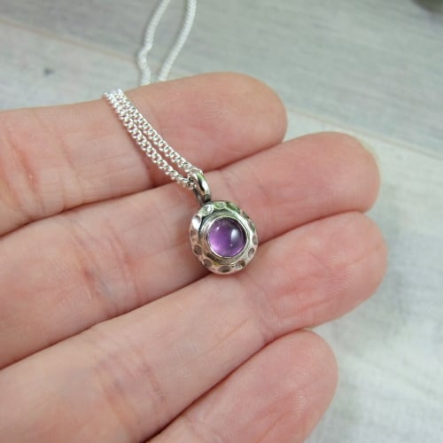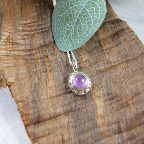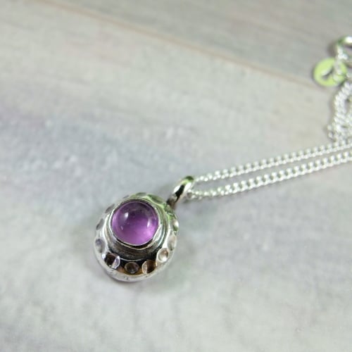 I have created the pendant from recycled silver heated to melting point then left to cool and slightly flattened. To this I have added a silver cup in which I have set a 3mm Amethyst cabachon and fitted to sterling silver 18 inch chain (16 inch chain available if preferred).