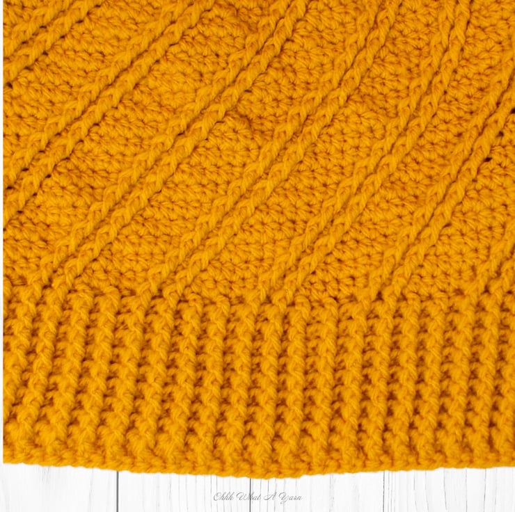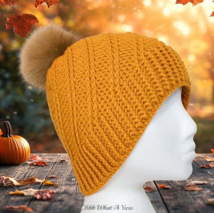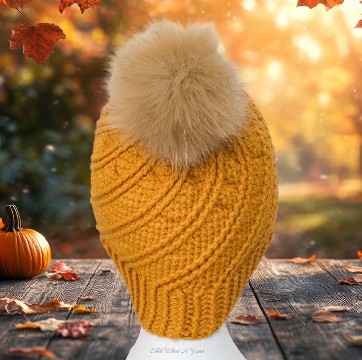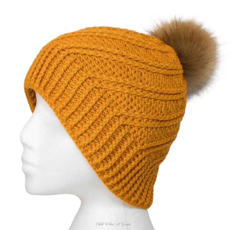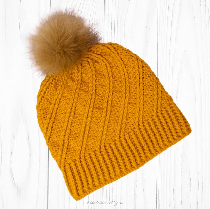 It has a gorgeous ridge pattern that creates a fabulous swirl effect and a ribbed edging. I have added a faux fur pom pom. There is a button on the inside of the hat so you can easily remove the pom pom by unhooking the loop around the button if you prefer your hat fluffless and for washing purposes.