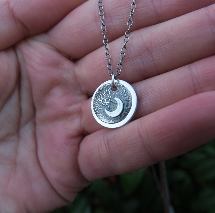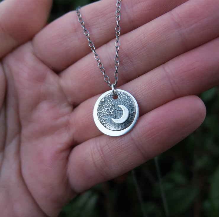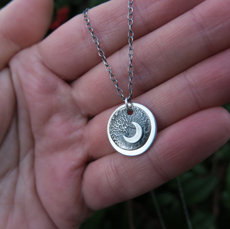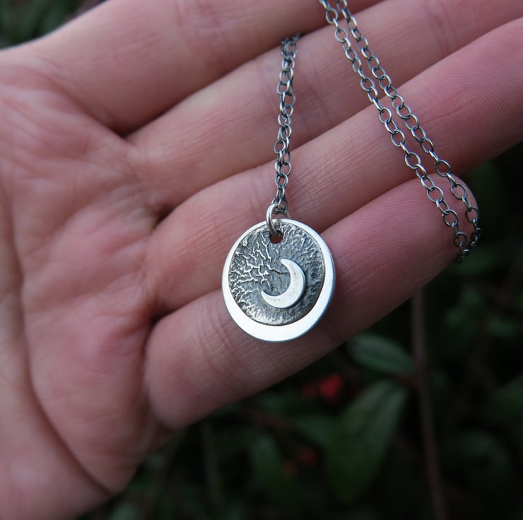 Discs have been hand cut from a sterling silver sheet. Bigger is brushed, smaller reticulated to achieve a raw silver effect. Then we soldered a small crescent moon accent on it. Finally, we oxidized and hand polished the smaller disc to highlight the design details.