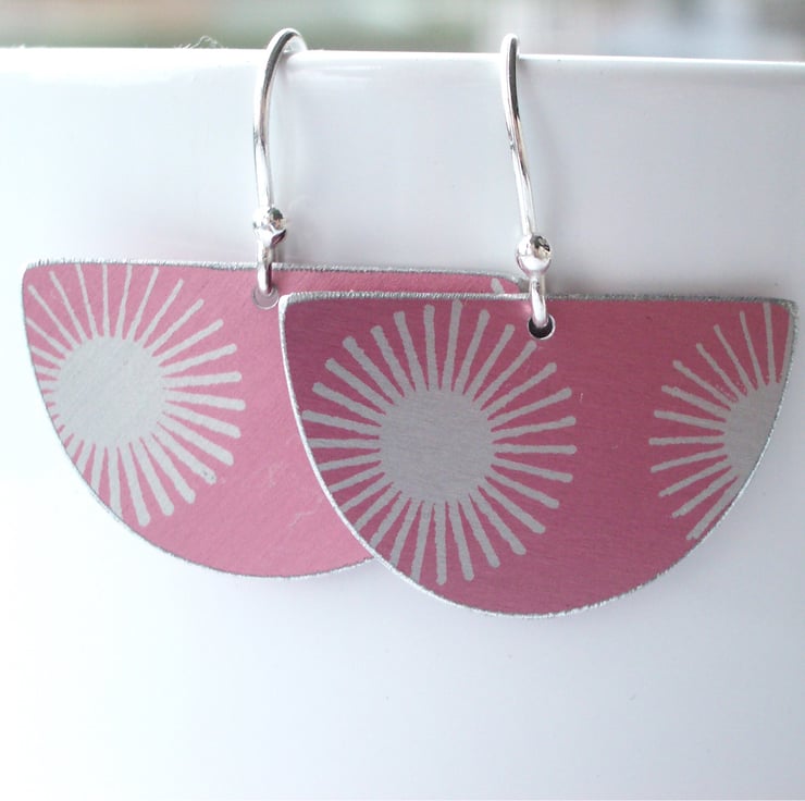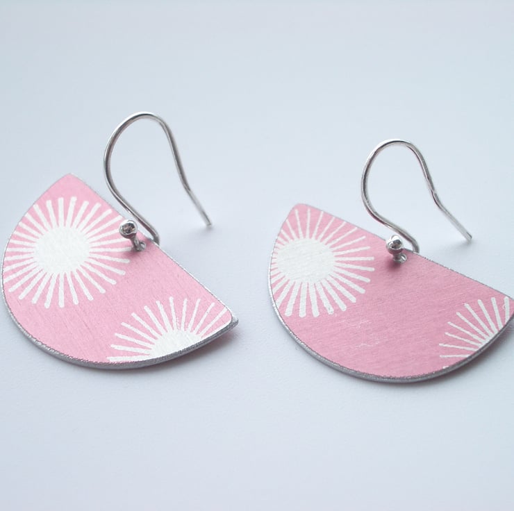 These mid century style fan shaped earrings are made from aluminium which I have hand dyed and printed in a pastel pink. The sunburst patterns are silver. I cut out the fan shape with a piercing saw and file the edges to give a nice smooth finish and a silvery edge. Please note, this pattern is fairly random and so may differ slightly from the one in the photograph.