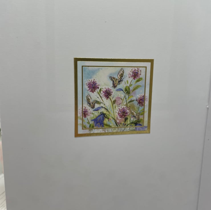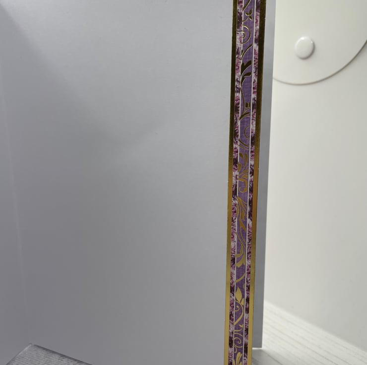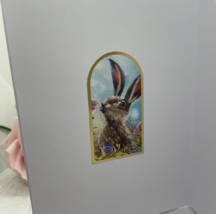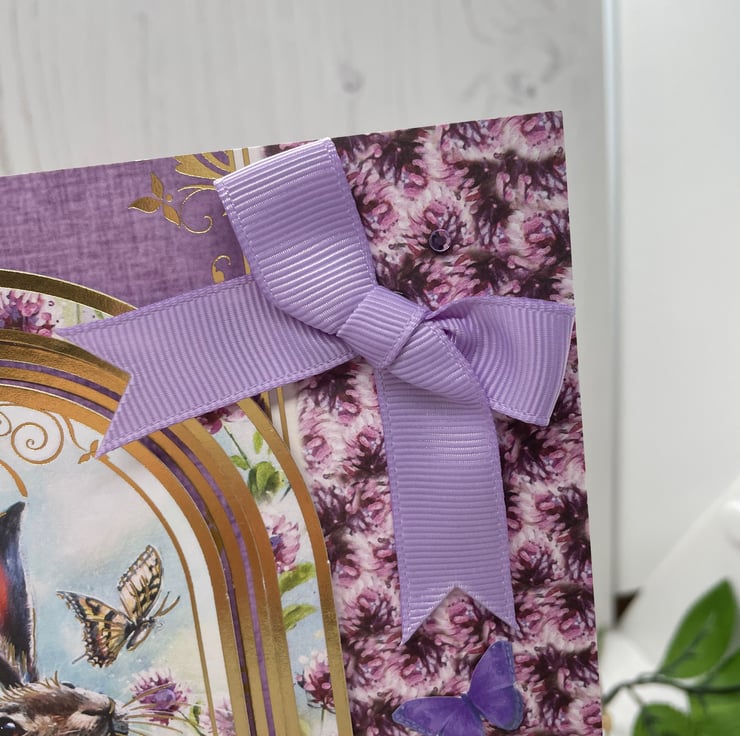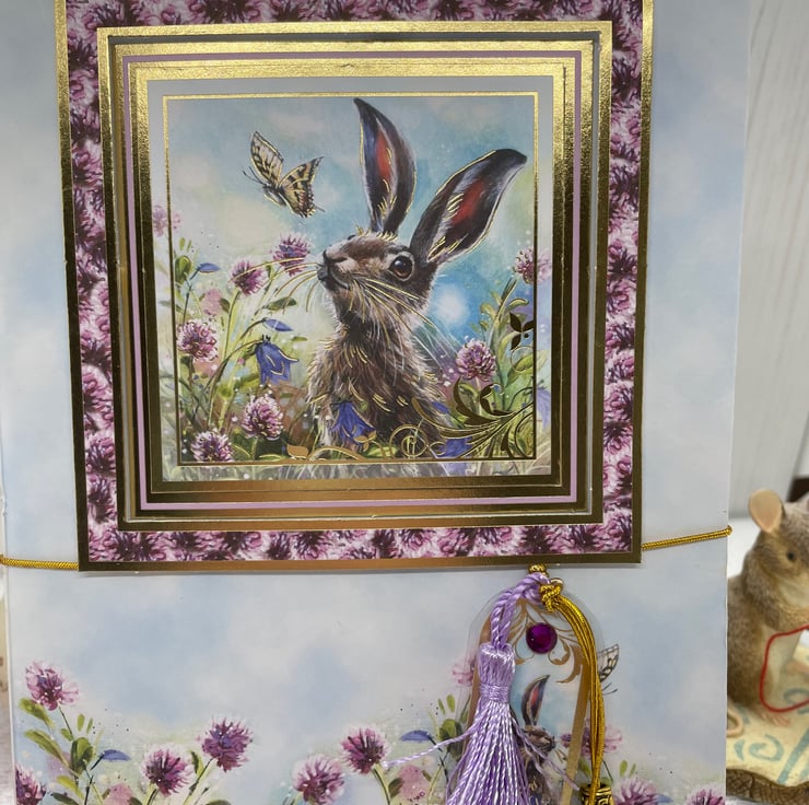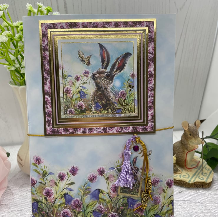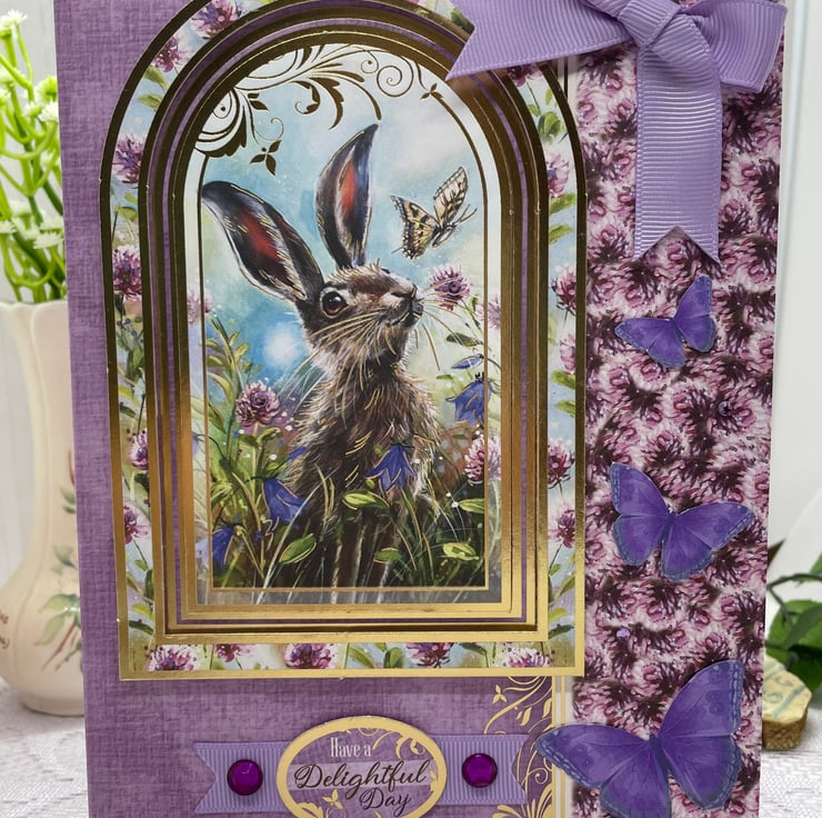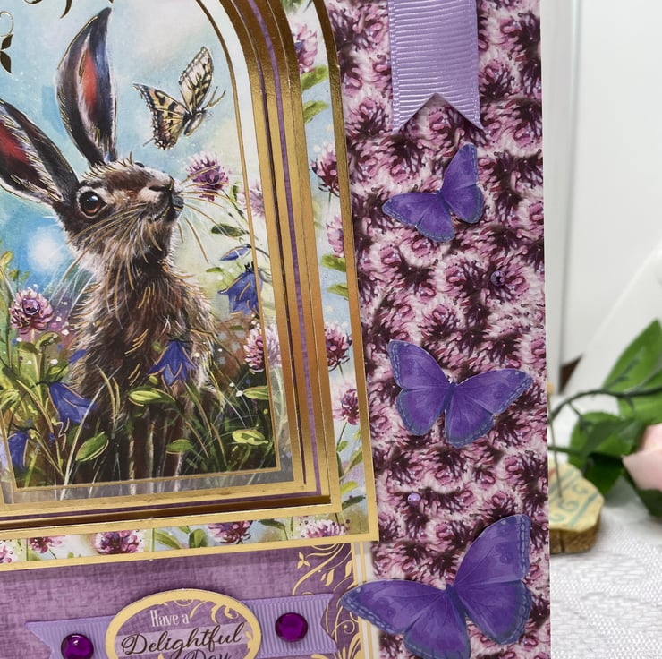 Hares in clover A5 card with lilac background, arched topper in a frame . Clover border print repeated on the back of the card. Butterflies on the border with a lilac bow. Lilac ribbon with the sentiment ‘Have a Delightful Day’ with crystals to embellish. Inside of the card has been left blank for your own message. Pretty border strip and a harr image on the inside of the card.