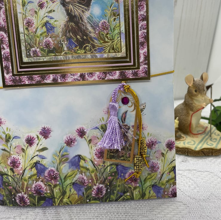A5 notebook with 40 plain pages. Clover border card with a framed hare image. Secured with gold elastic cord, tassel, laminated hair tag and gold tone beads.