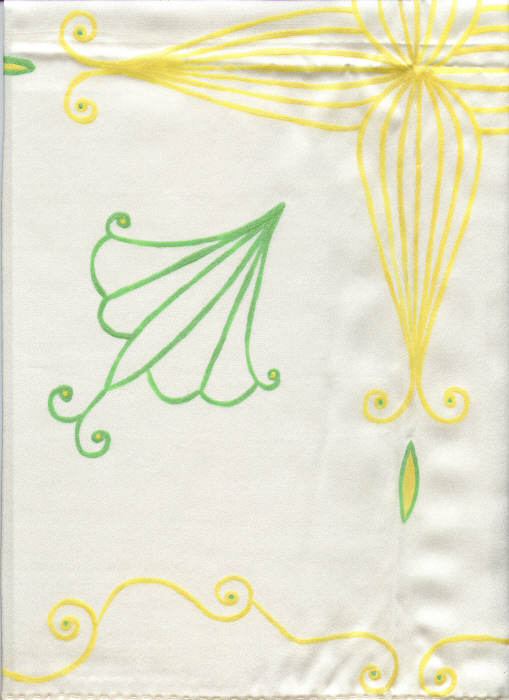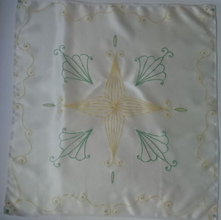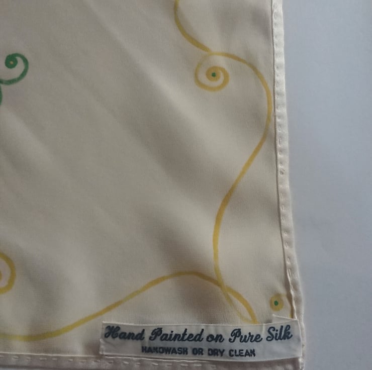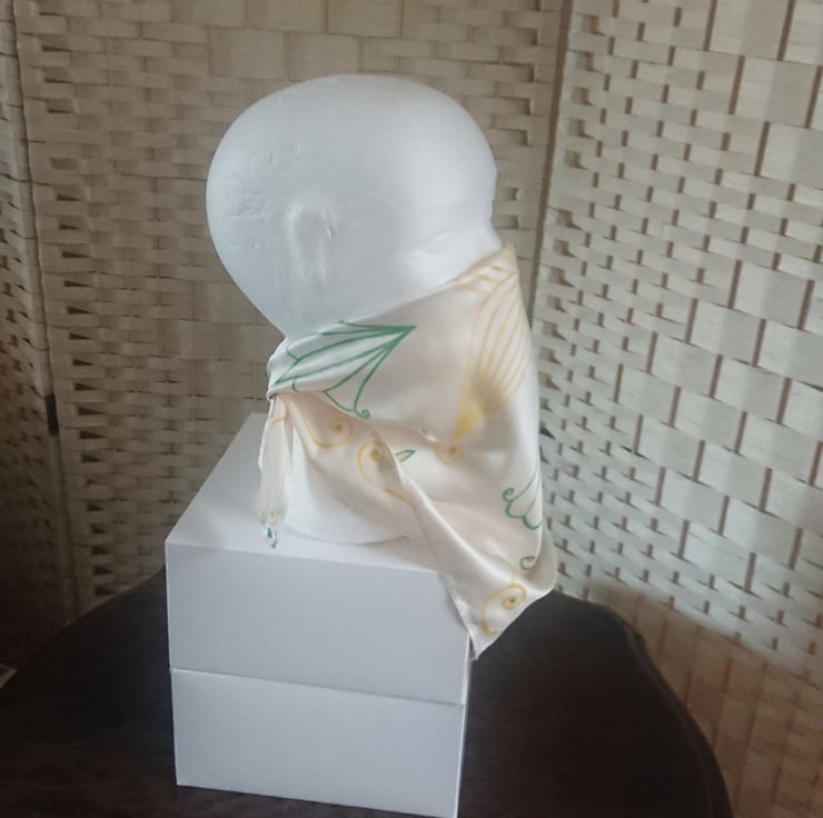 Silk white is not a bright white, just a soft white. The design is handpainted so there may be some irregularities in the painting as well as in the weave of the silk due to it being a natural fibre.