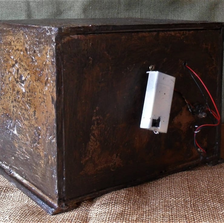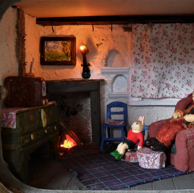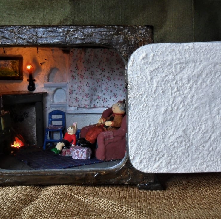 A handmade room box, and a couple of rabbits watching an old TV. Grandad and junior sitting by the fire.