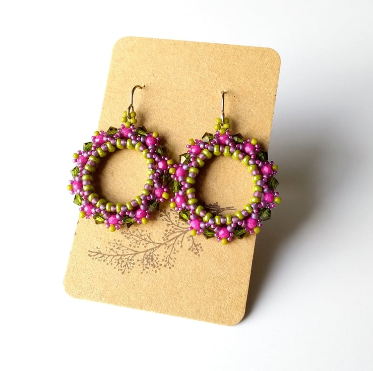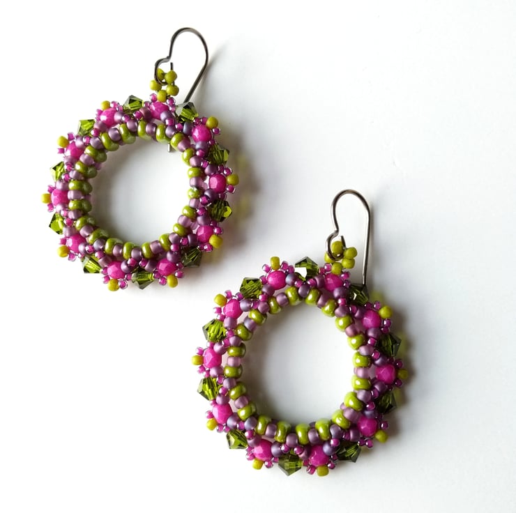 Twin-holed beads have been used to form a solid ring and then embellished with crystals and seed beads. This pair features sparkly Preciosa 4 mm crystal bicones in olivine green - plus faceted 3 mm bright magenta pink-coloured glass beads, together with seed beads in matte mauve, matte lime green and fuchsia pink.