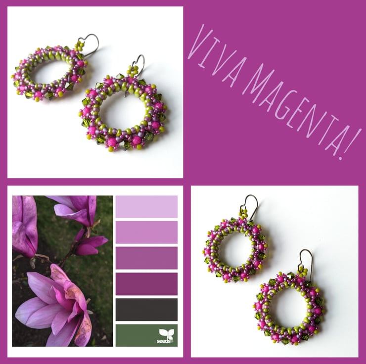 Beautiful crystal and glass seed bead earrings hand-woven with just a needle and thread. This vibrant pair has been inspired by Pantone's colour of the year for 2023, Viva Magenta - I hope you like them!