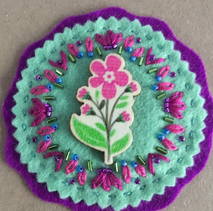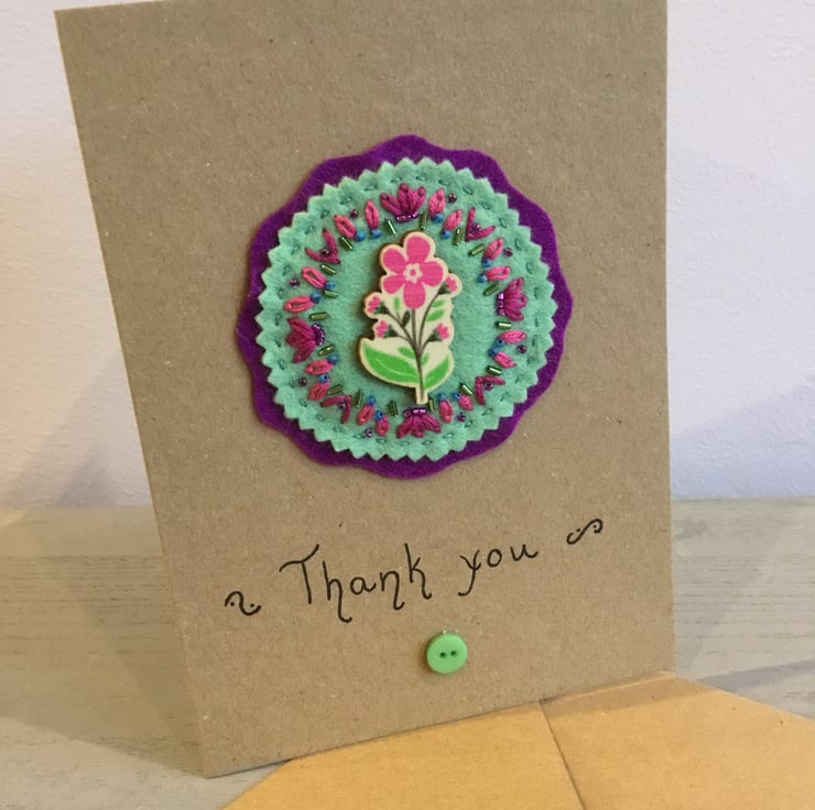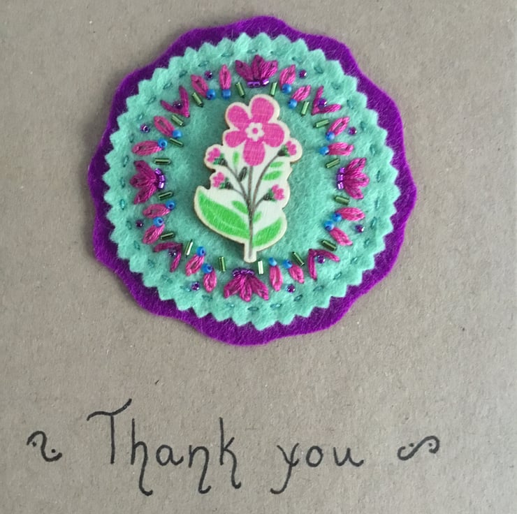 This Hand Embroidered Flower Card says ‘Thank you’ in a special hand embroidered way. A wooden pink Flower motif sits on circles of pale green and magenta felt. It’s surrounded by a border of hand embroidered petals in Lazy Daisy Stitches, dotted with beads in an array of magenta, pink, blue and green colours.